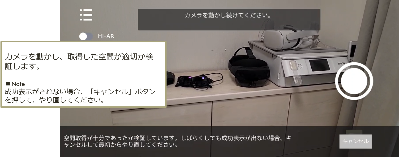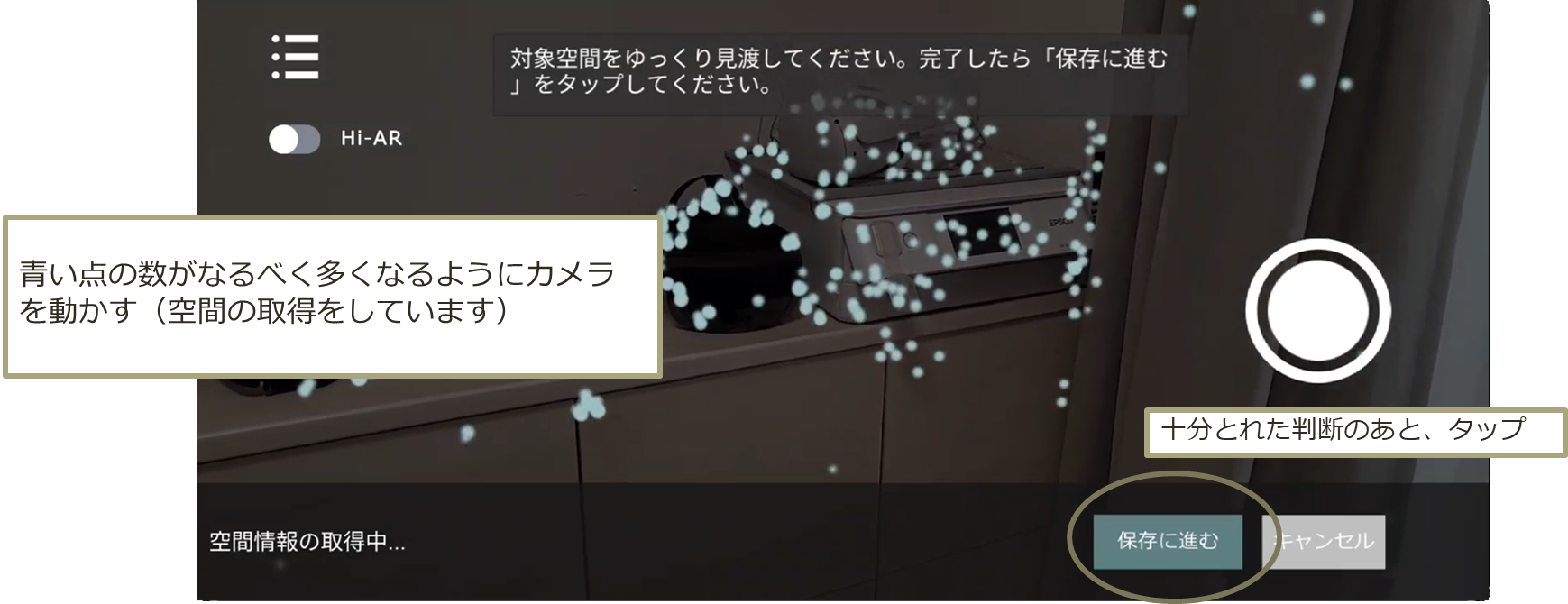 空間取得時に、背景がカメラに映らないように対象へカメラを向けたまま、対象周辺を回る