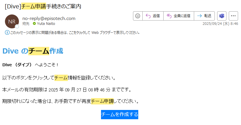 下記のようなメールが届きますので、[チームを作成する]から、必要情報を入力すれば無料プランを開始できます。