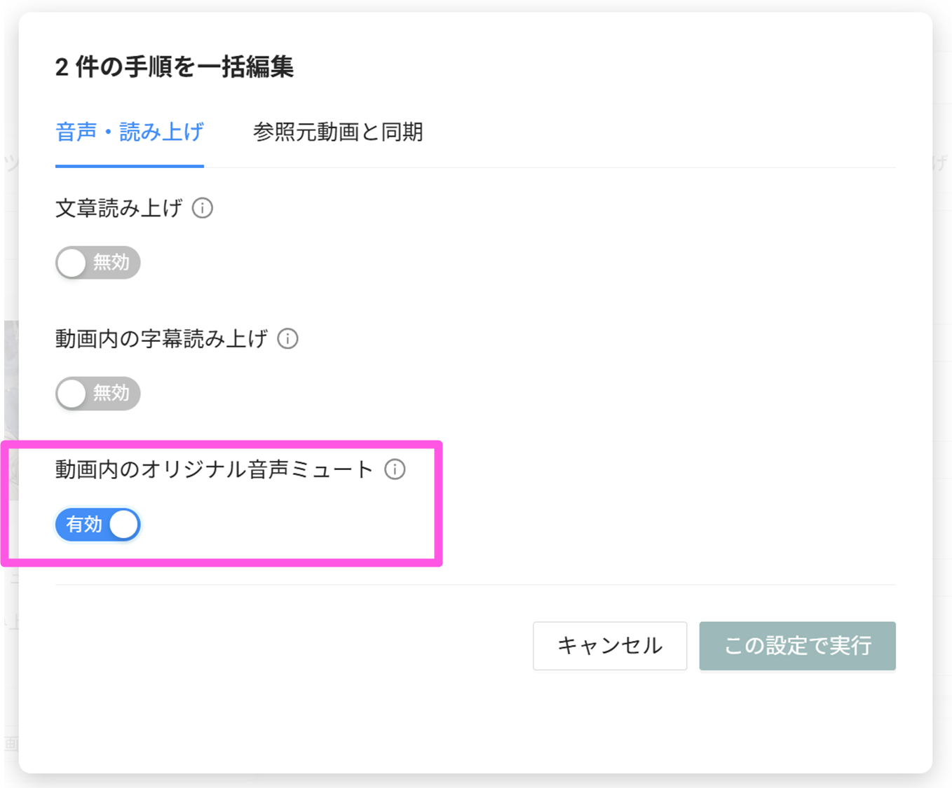[動画内のオリジナル音声ミュート]を有効に、[この設定で実行]をクリックします。