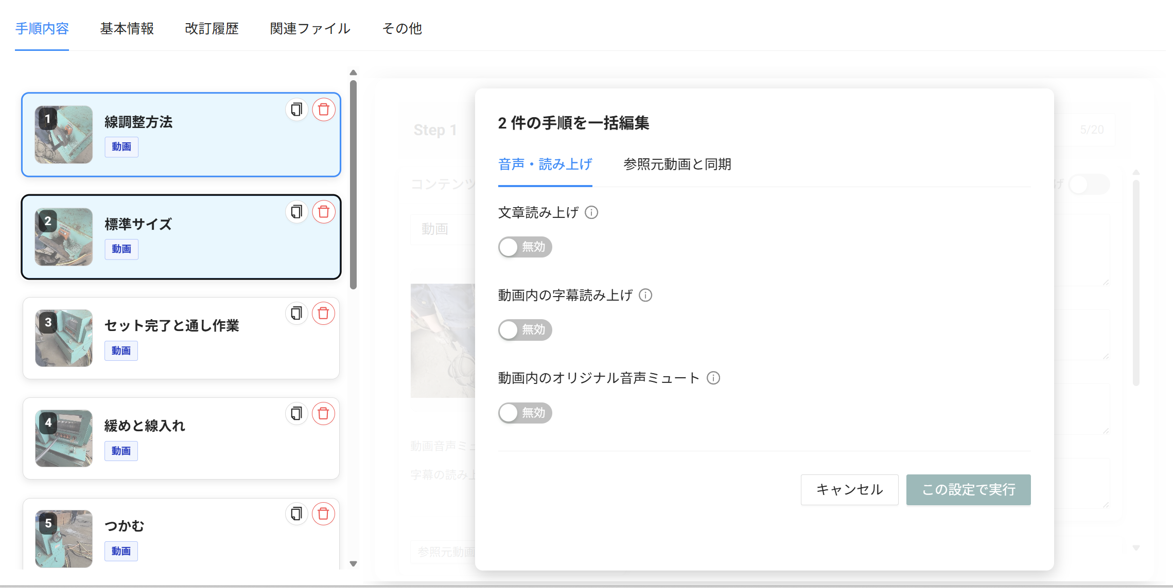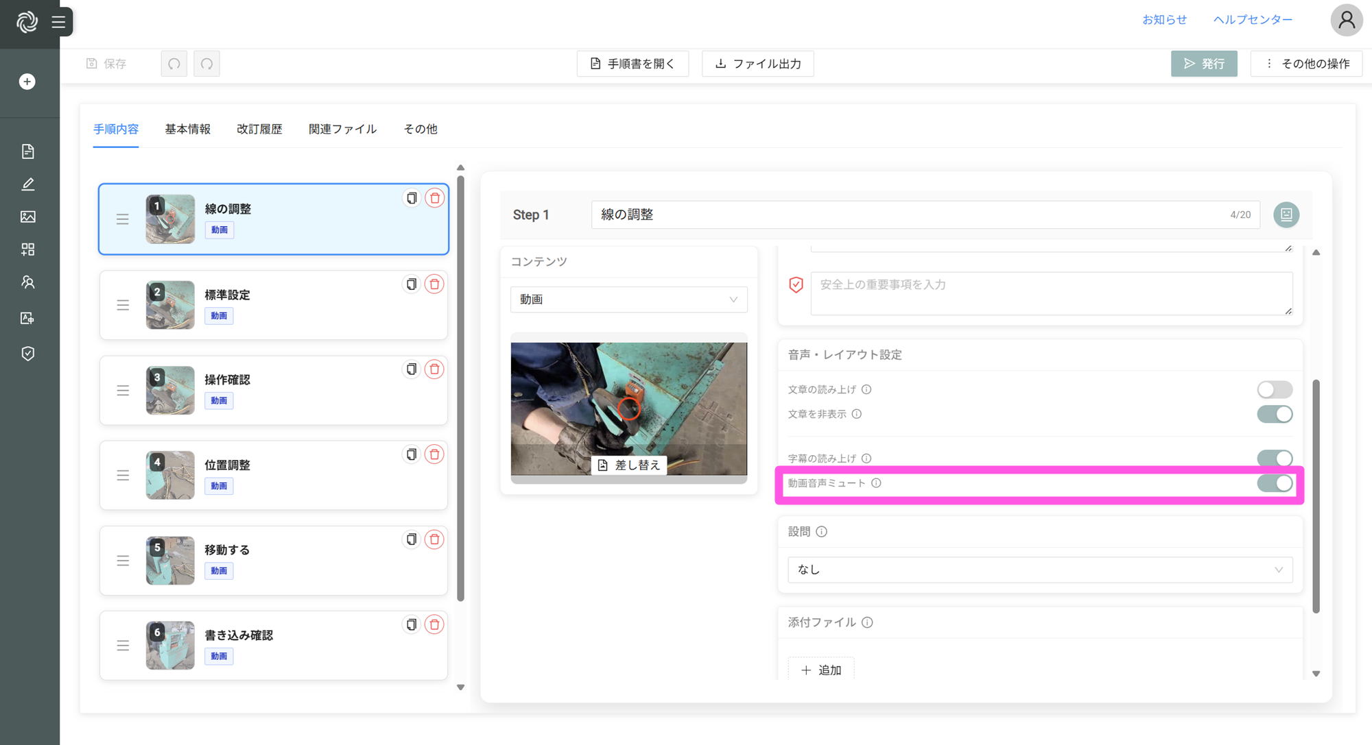 手順書の詳細編集画面にて、対象の手順をクリックして動画音声ミュートの設定変更で実現できます。