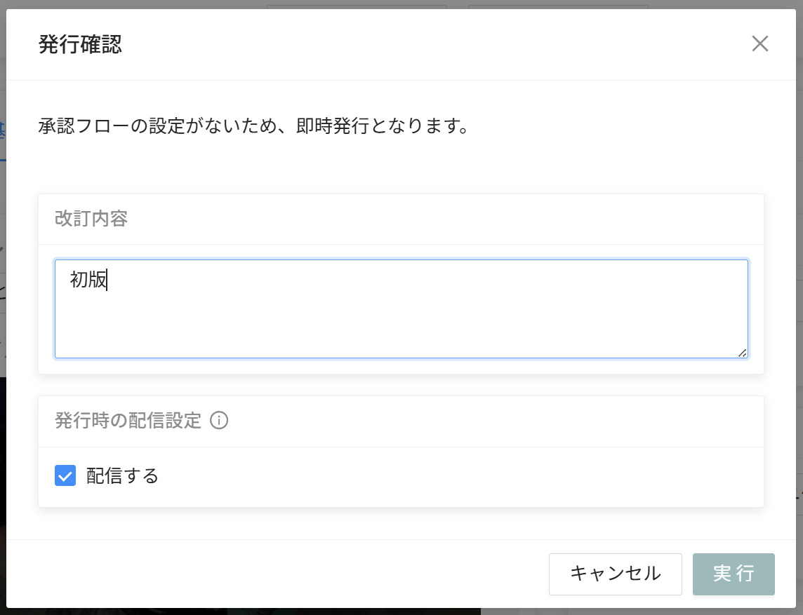 承認依頼時に「発行時の配信設定」で配信の有無を設定できます(デフォルトはON)。