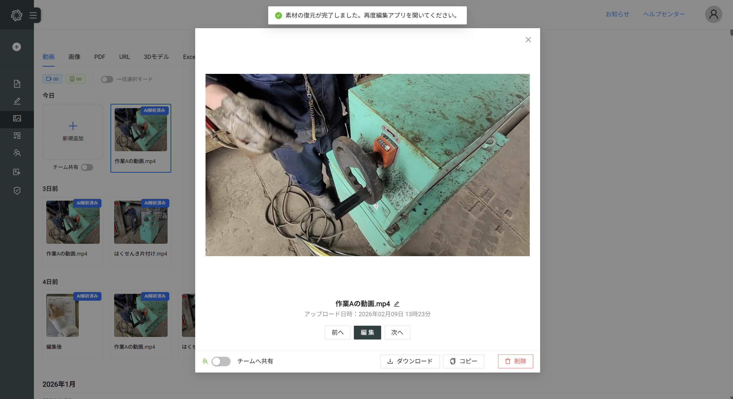 - 復元処理が実行され、動画素材の編集画面が自動で閉じます(自動で閉じない場合、手動で閉じてください)。復元結果を確認する際は、再度動画素材の編集画面を開いてください。