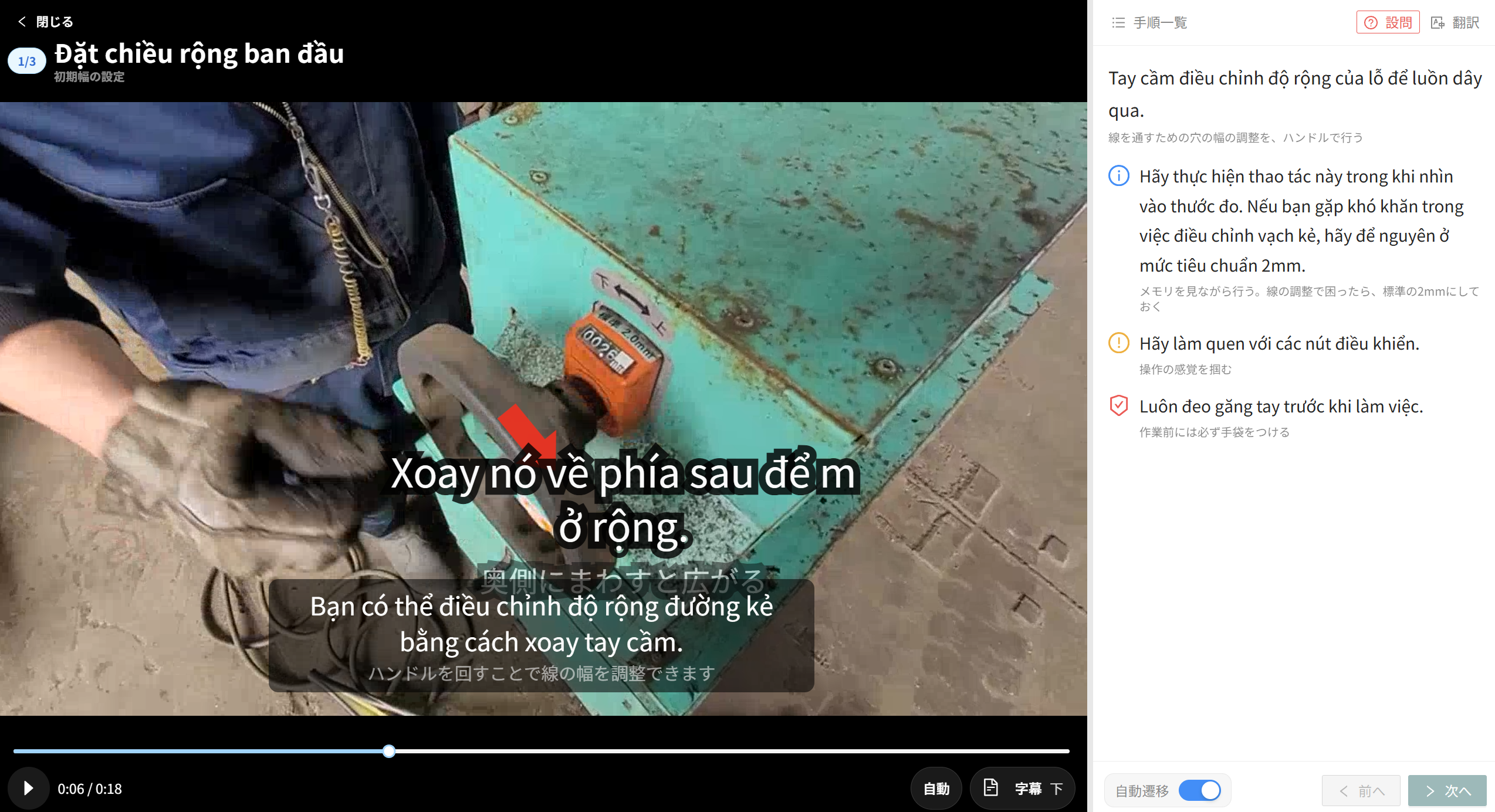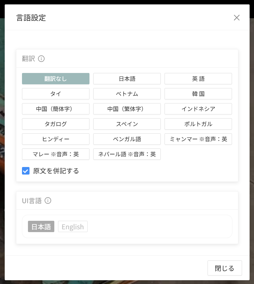 自動翻訳のやり方 2026年03月17日 23:50 更新 [翻訳]をクリック 所望の言語をクリック補足:UI言語も変えたい場合、そちらも設定(日本語/英語)。原文併記が不要であれば、[原文を併記する]のチェックを外してください。自動翻訳がされます。読み上げ音声も現地の言語になります。 関連記事 自動翻訳で対応している言語 字幕・文章読み上げ機能 PDF出力・EXCEL出力 Step4 手順書を発行しましょう 翻訳用語集