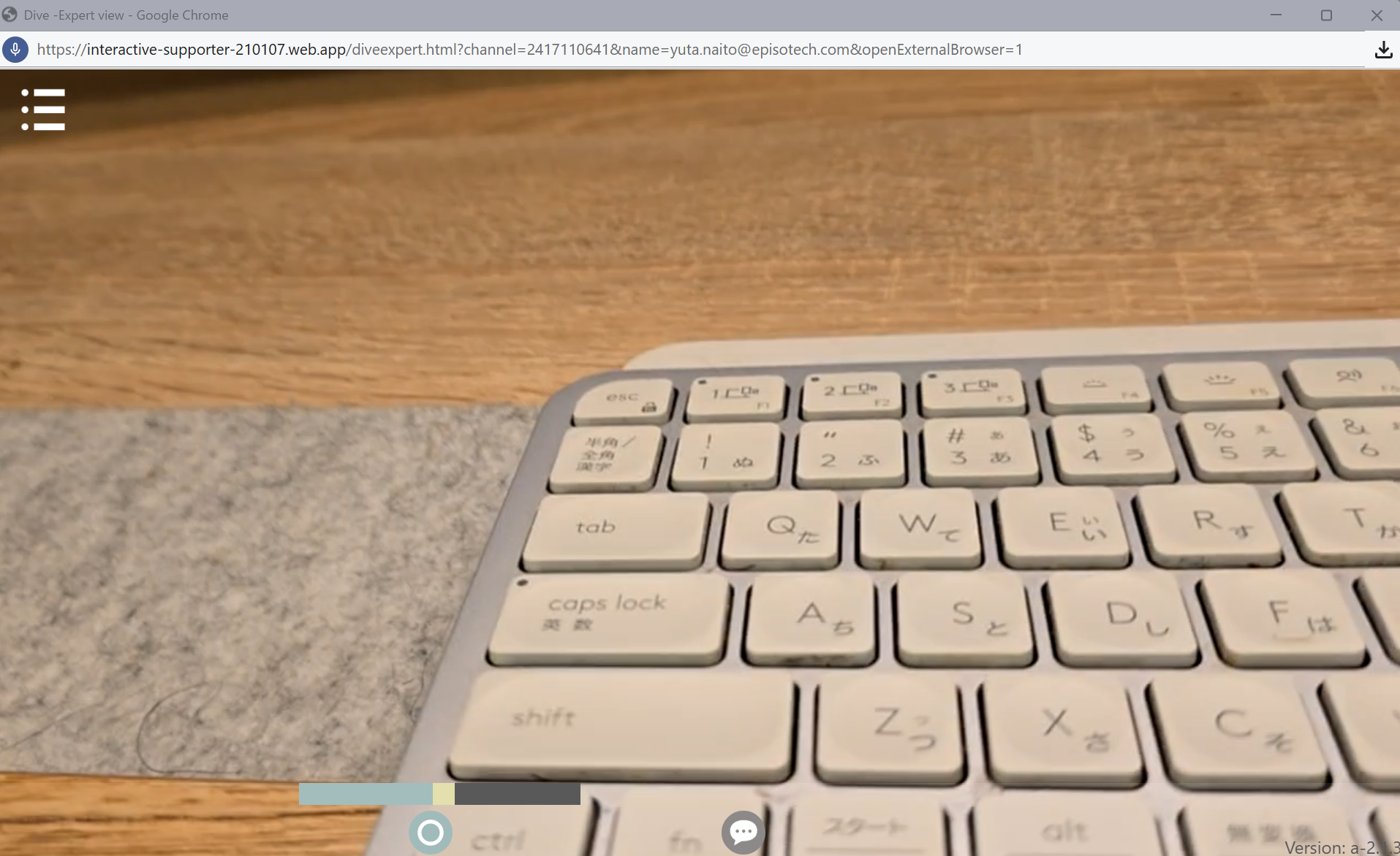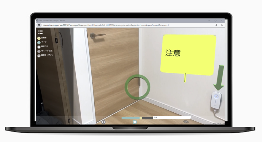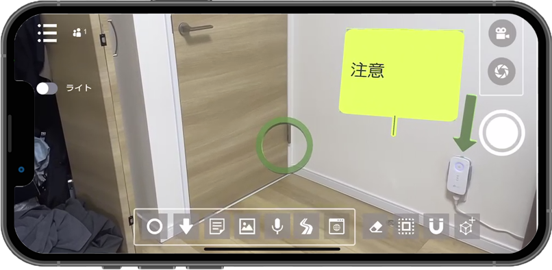 現場側のカメラ画像が表示されます。画面上をクリックし続けると、マルやテキストをARでその場に表示されます(離すと自動で消える)。画面共有、画面キャプチャも可能です。