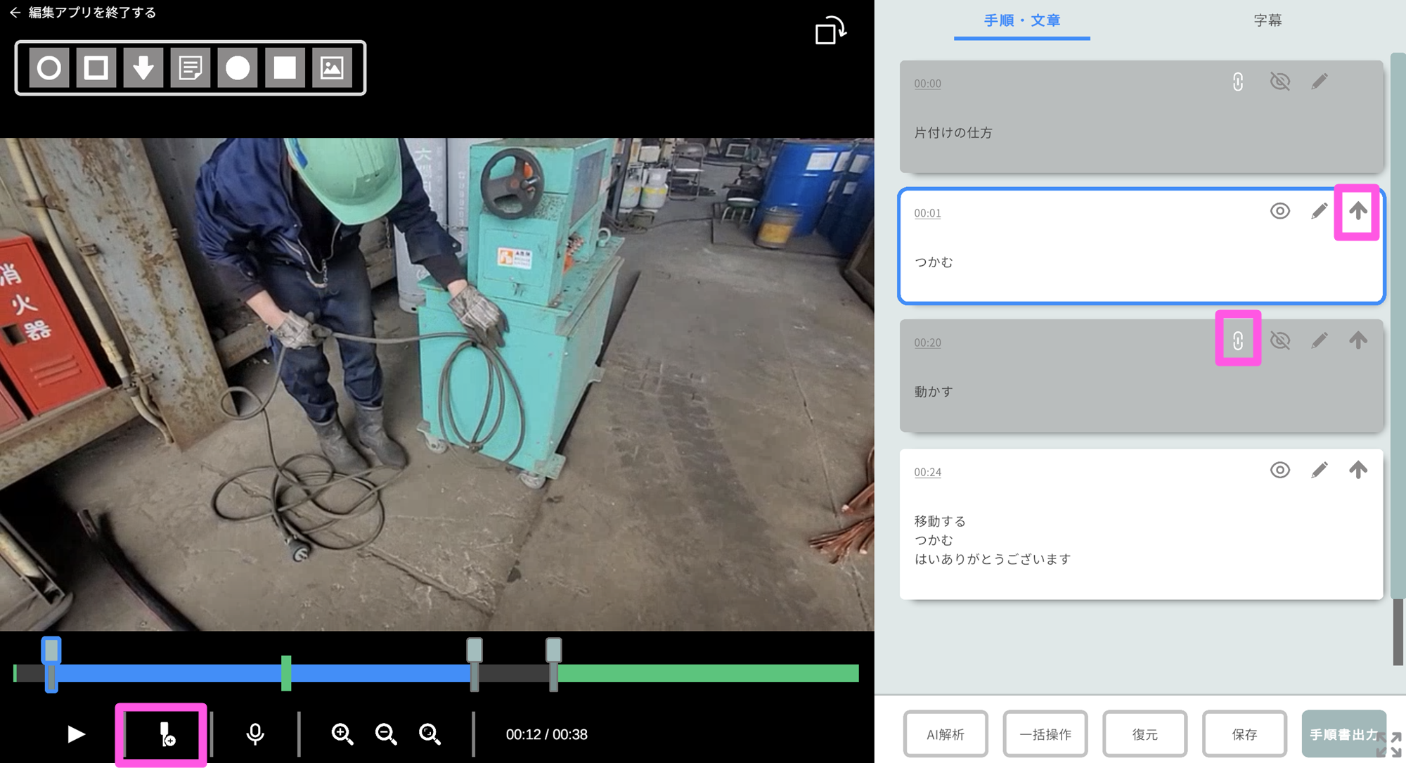 「詳細編集画面での手順削除操作を、動画編集画面での手順結合操作のアイコンが同じ混同する。」