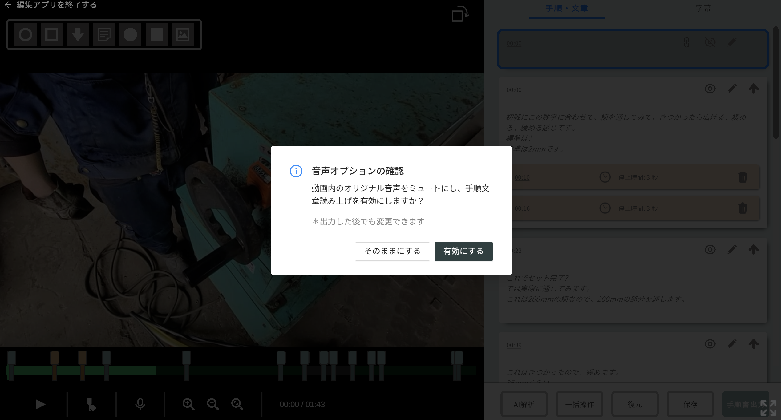 1つの手順が長めの動画である場合、字幕読み上げが有効であることもあるかと思いますのでその際は、詳細編集画面にて設定をお願いします。