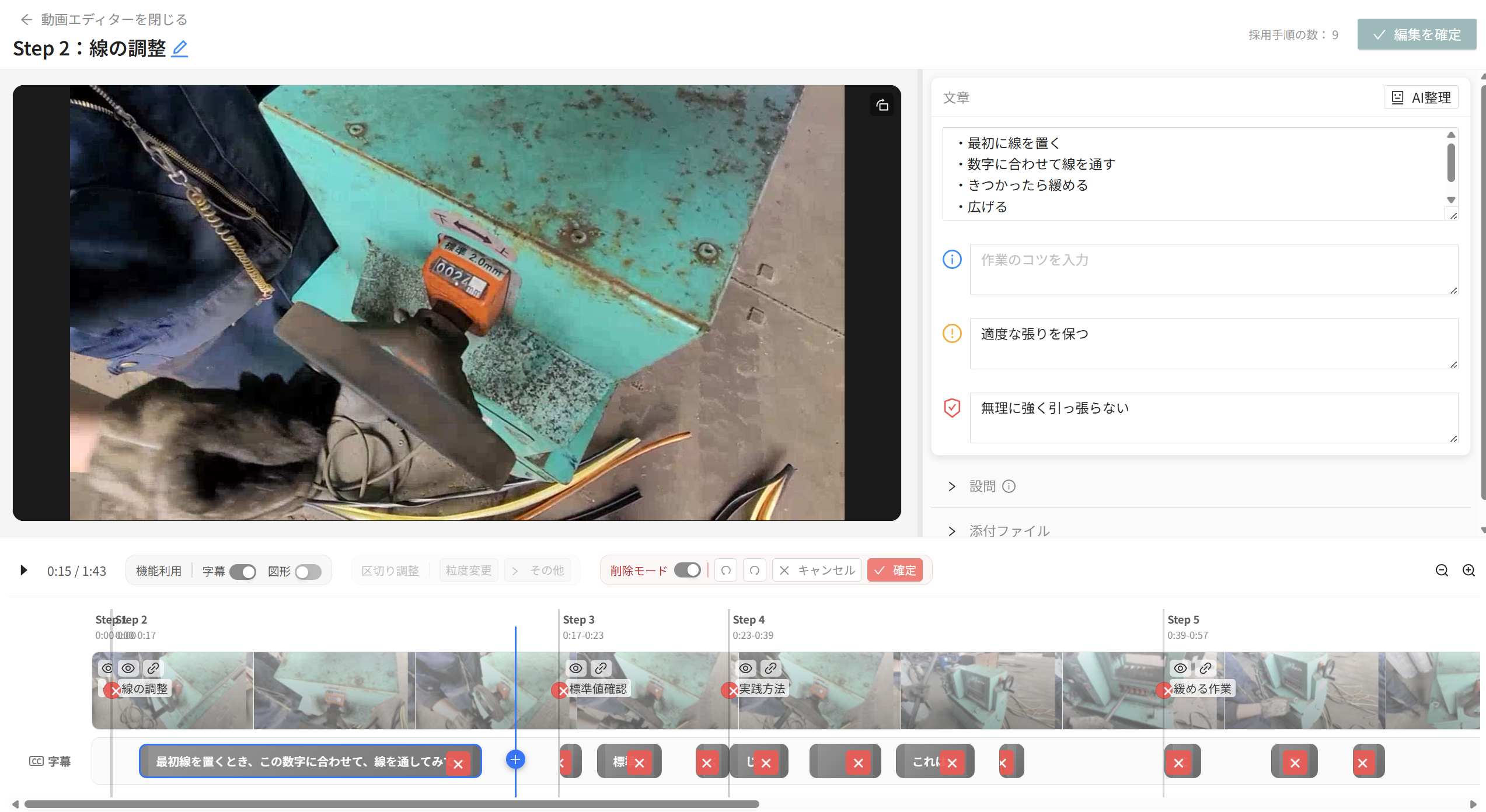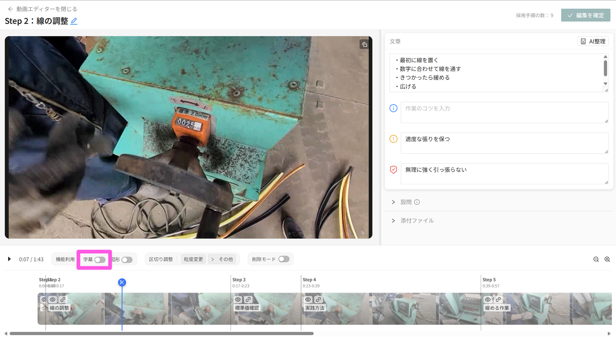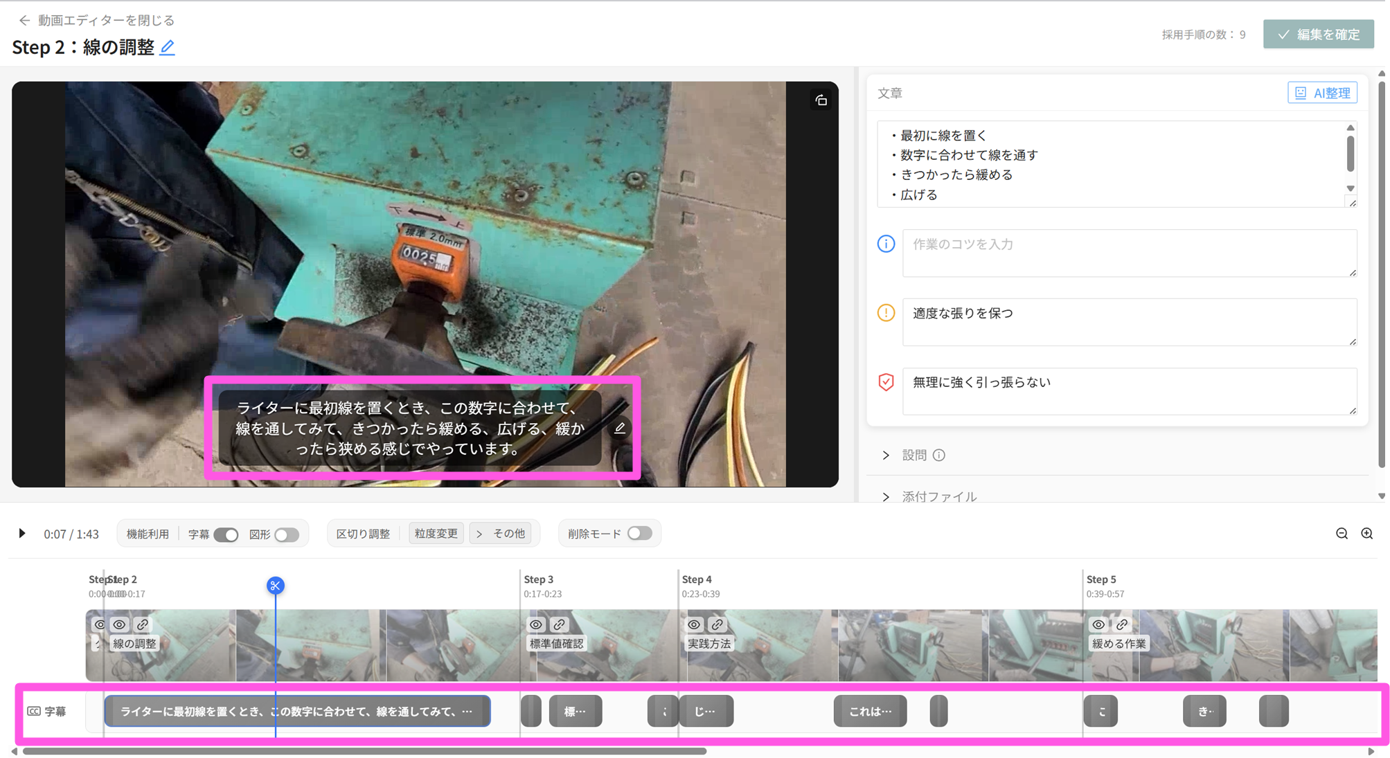 - 動画内に字幕、タイムライン内に新たに字幕用のタイムラインが追加されます。初期値として、AI解析時に文字起こしした内容が入っています。