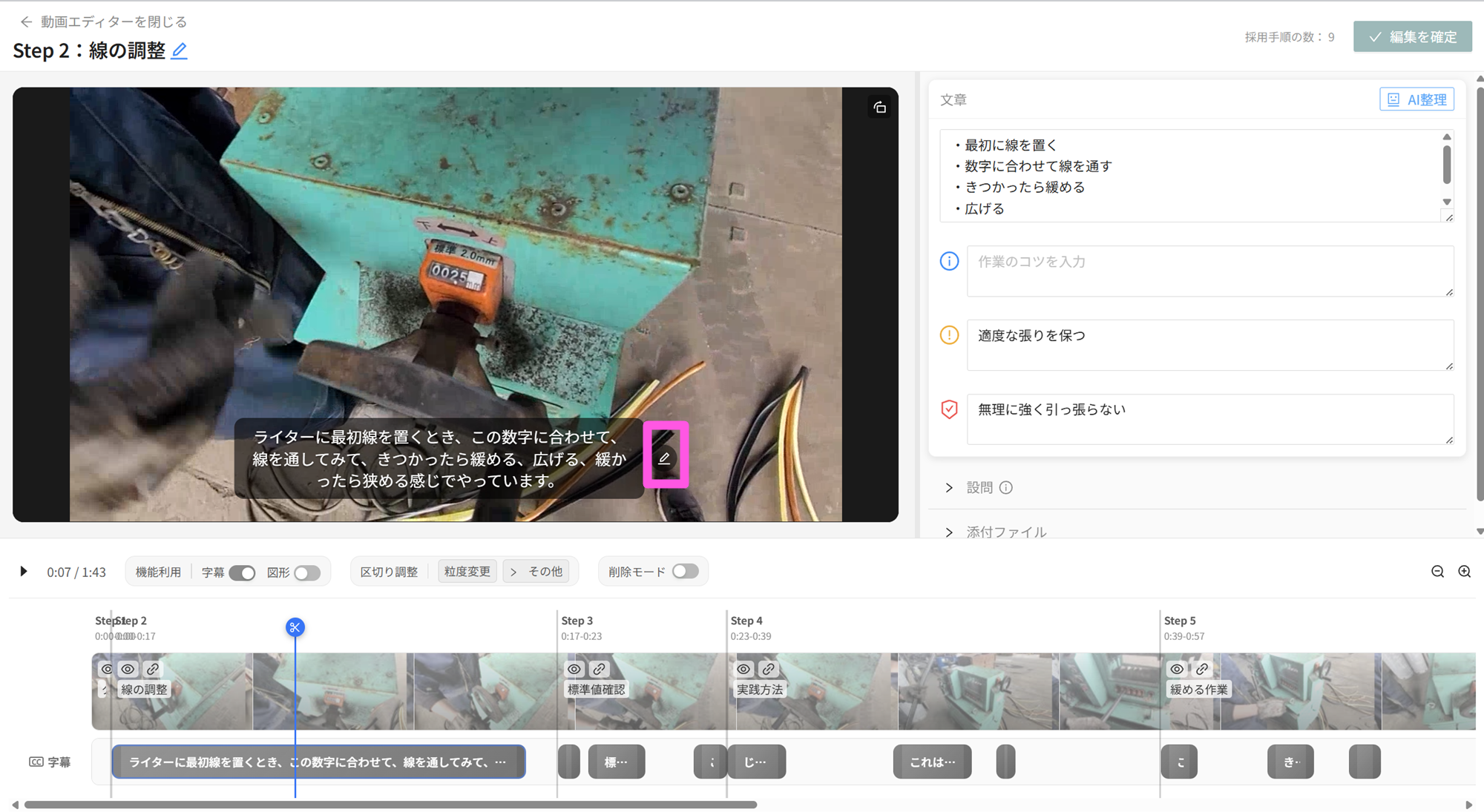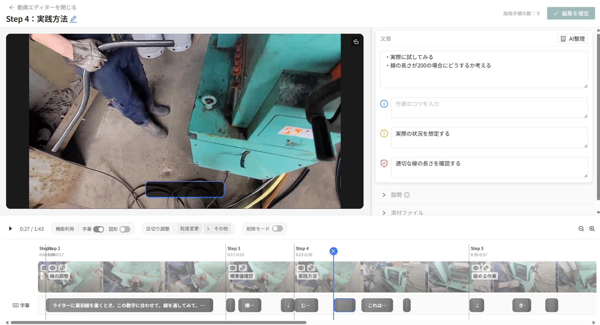 - 文字起こし内容に誤りがあれば、編集しましょう。動画内の[ペン]ボタンをクリックし、編集ができます。