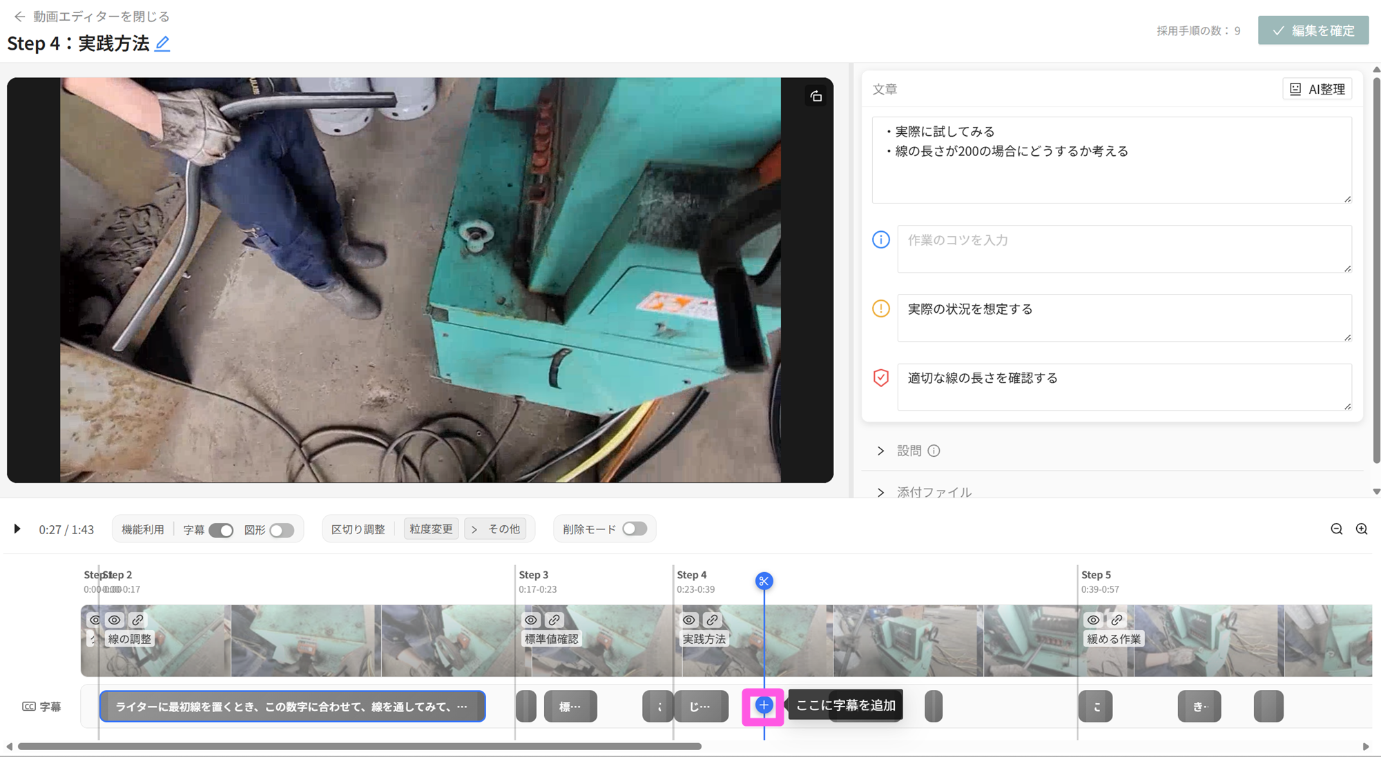 新規で追加もできます。当該の箇所へシークし、[+]ボタンから新規字幕を定義できます。