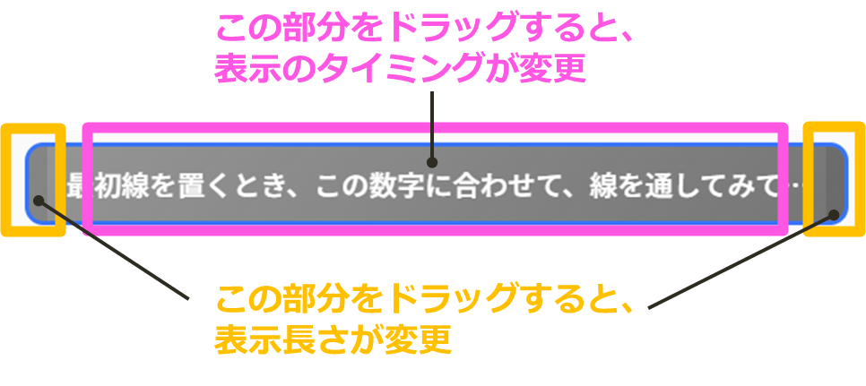 - 字幕の表示タイミングは、タイムラインから当該の字幕ブロックのドラッグ、表示長さの調整は端をドラッグすることで可能です。