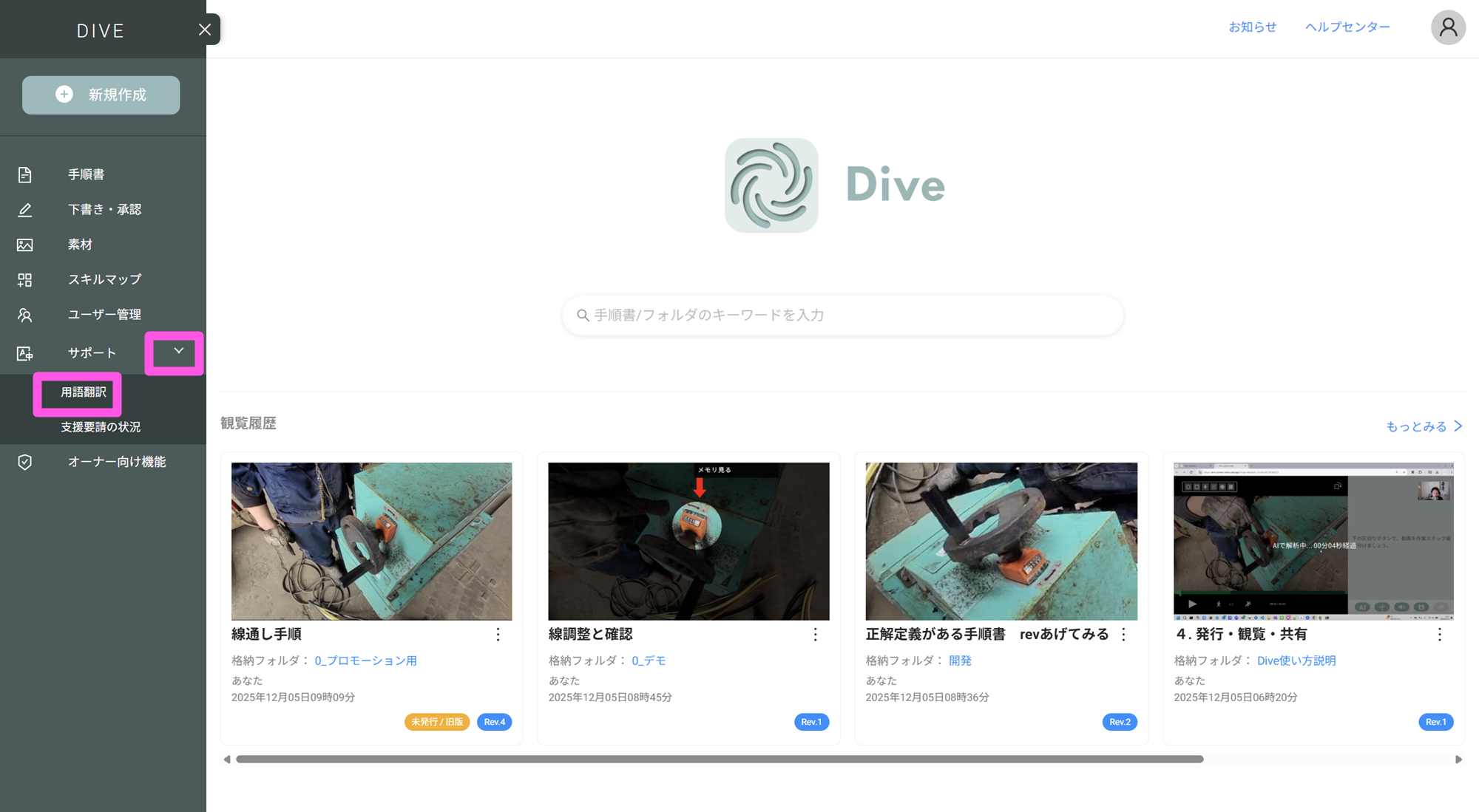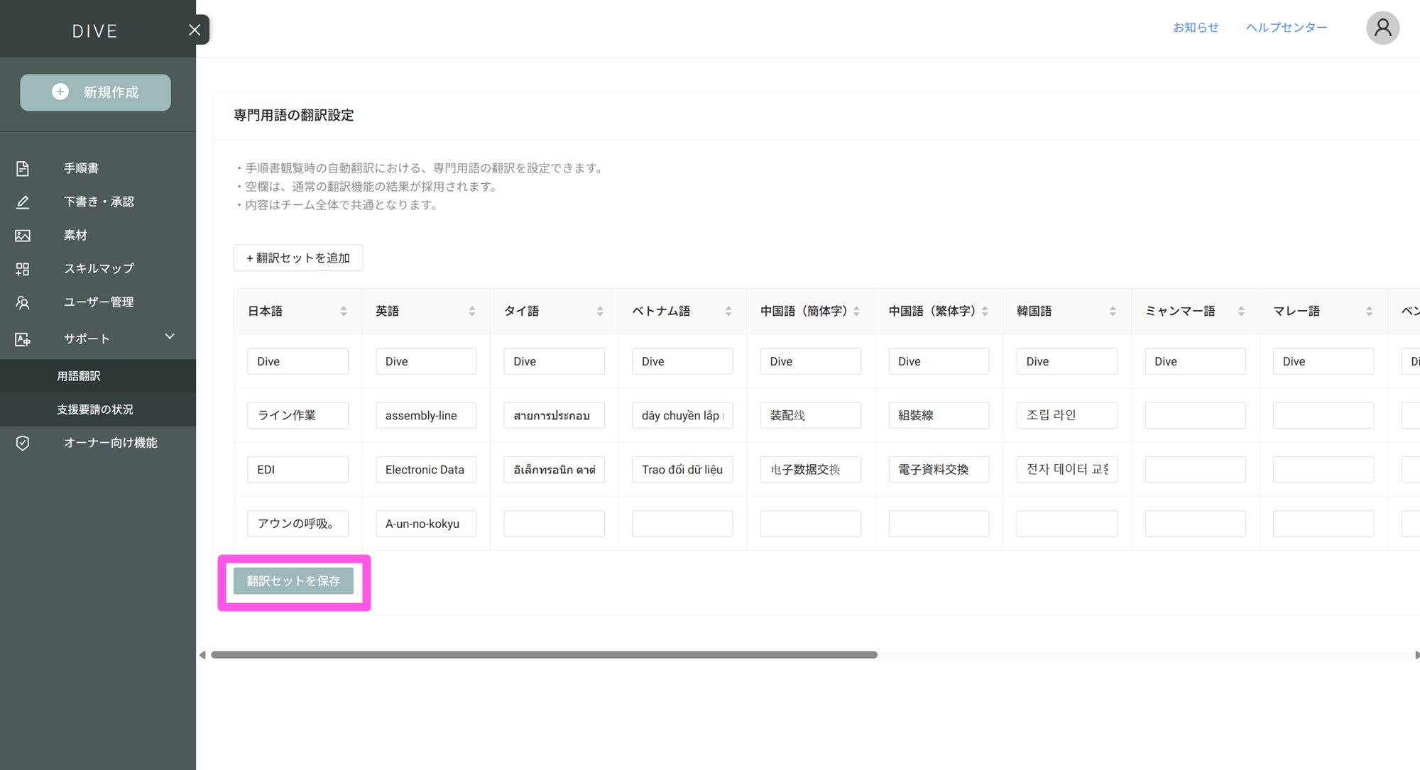 手順書を観覧時の自動翻訳機能にて、あらかじめ設定しておいた言語毎に対となる言葉を事前に用意しておくと、その内容を優先して翻訳が行われます。