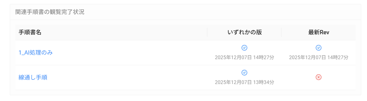 スキルマップで関連づけされた手順書が観覧完了できるか確認できる機能がありましたが、「いずれの版をみたか」「最新は見ているか」がわかるようになりました。改訂後の教育がちゃんとできているか?など活用いただけます。