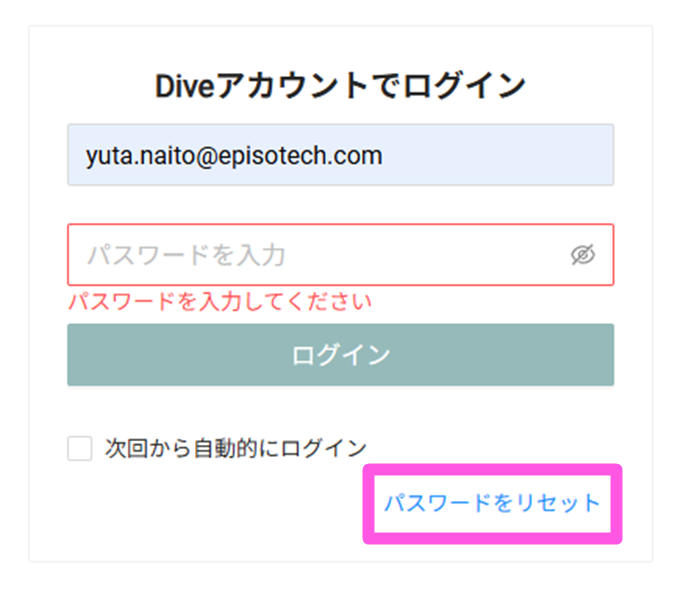 パスワードを変えたい/忘れた 2025年12月18日 08:38 更新 パスワードリセットが必用となります。 ログイン画面で、ご自身のメールアドレスを入力したあと、[パスワードをリセット]をクリック 成功メッセージがでましたら、システムよりメールが送信されます。 noreply@episotech.comより届く、メールのリンクからパスワードリセットをしてください。 関連記事 Step4 グループを設定しよう(管理者向け) ユーザー招待 ゲストアカウントとはなんですか 有償プランの無料トライアルの開始方法・サポート Step0 はじめての方へ