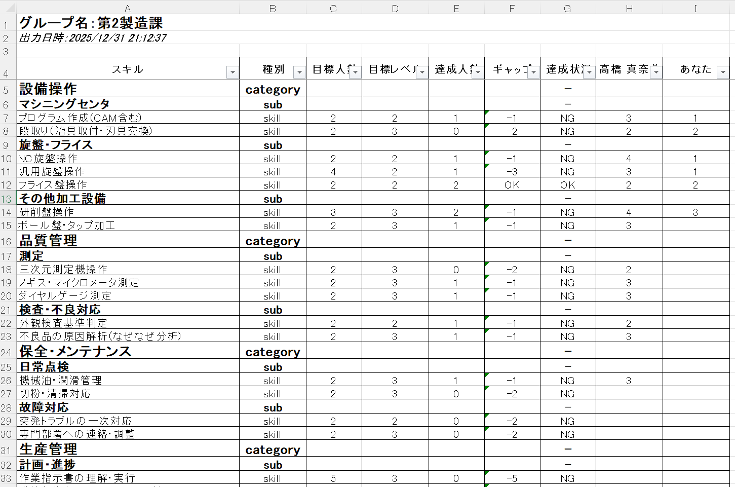 上記②に関連して、スキルマップもエクセル出力ができるようになりました。更新時のバックデータとしての活用にも◎