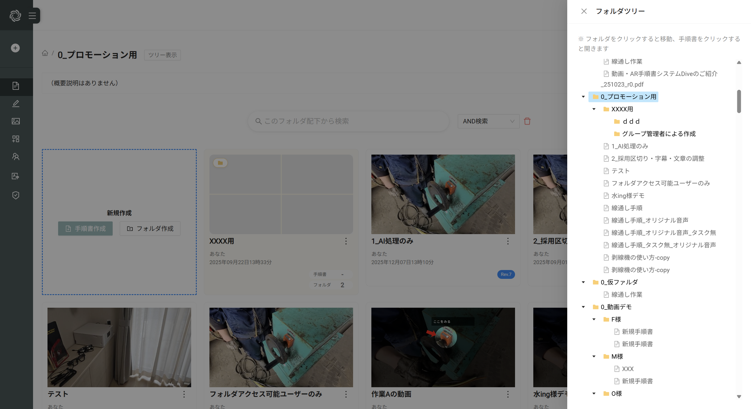 フォルダ・手順書の一覧確認を容易化する、フォルダツリー機能が実装されました。フォルダ名横にある[ツリー表示]ボタンからご確認ください。現在の場所をわかりやすく、かつ当該のデータにすぐアクセスできます。この機能は、フォルダ選択やスキルマップの手順書選択でも同様に活用できます。