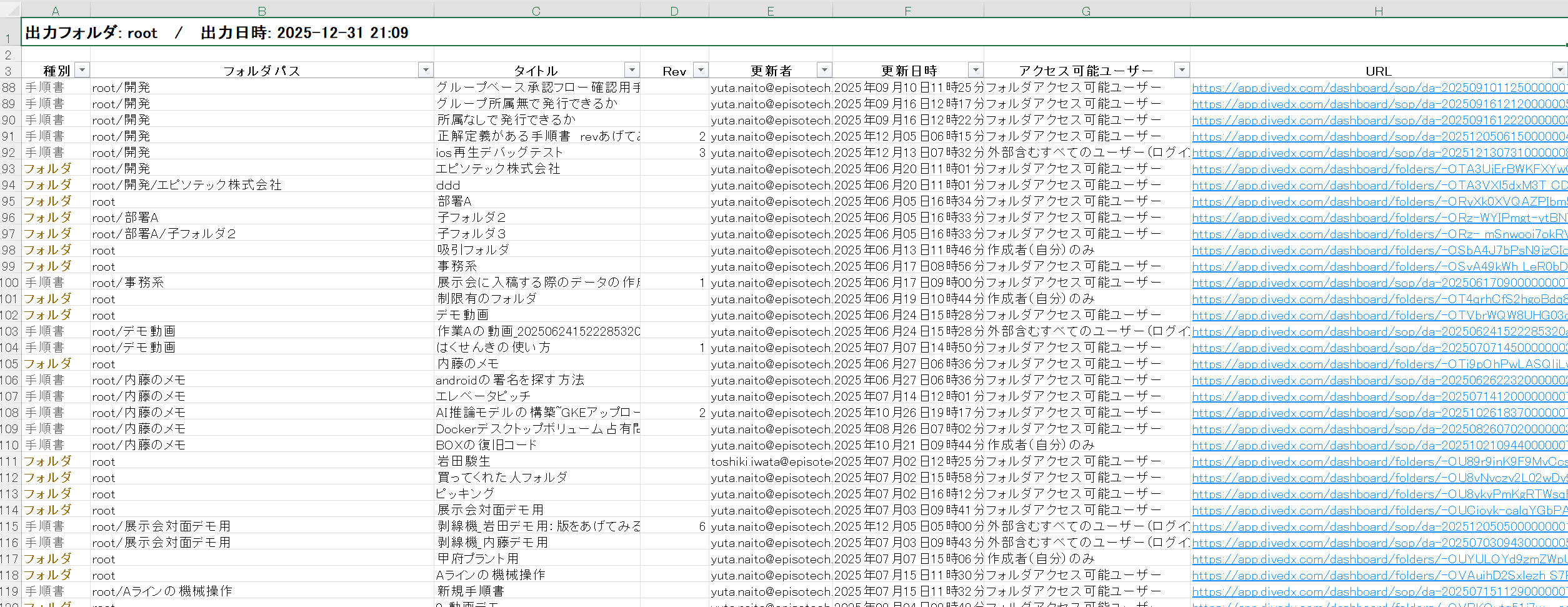 監査の対応や、管理者目線から「今なにが最新状態としてあるのか?」の確認を効率化するために、手順書一覧をエクセル出力する機能が実装されました。フォルダの[・・・]の選択肢から、[Excel出力]からお試しください。当該フォルダ配下以下にて、当該ユーザーがアクセスできるデータが対象となります。監査対応においては、すべてのデータを出力するためにチーム管理者/オーナー権限をもつユーザーで出力ください。