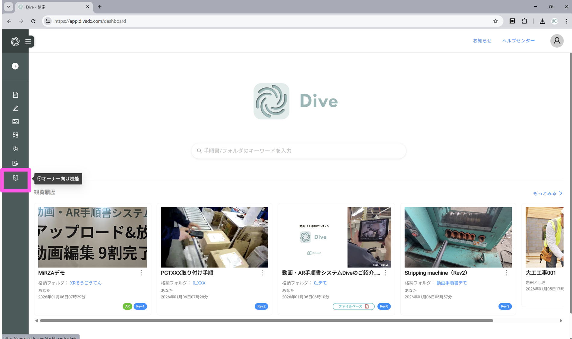 - Diveにログインし、[オーナー向け機能]をクリック