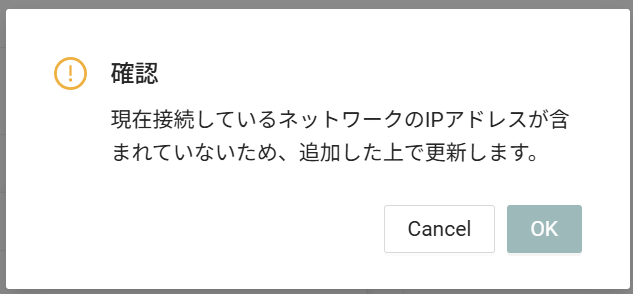 保存時、設定時に使っていないネットワークが含まれていない場合、下記メッセージがでます。自動で追加されますので、[OK]をクリックしてください。