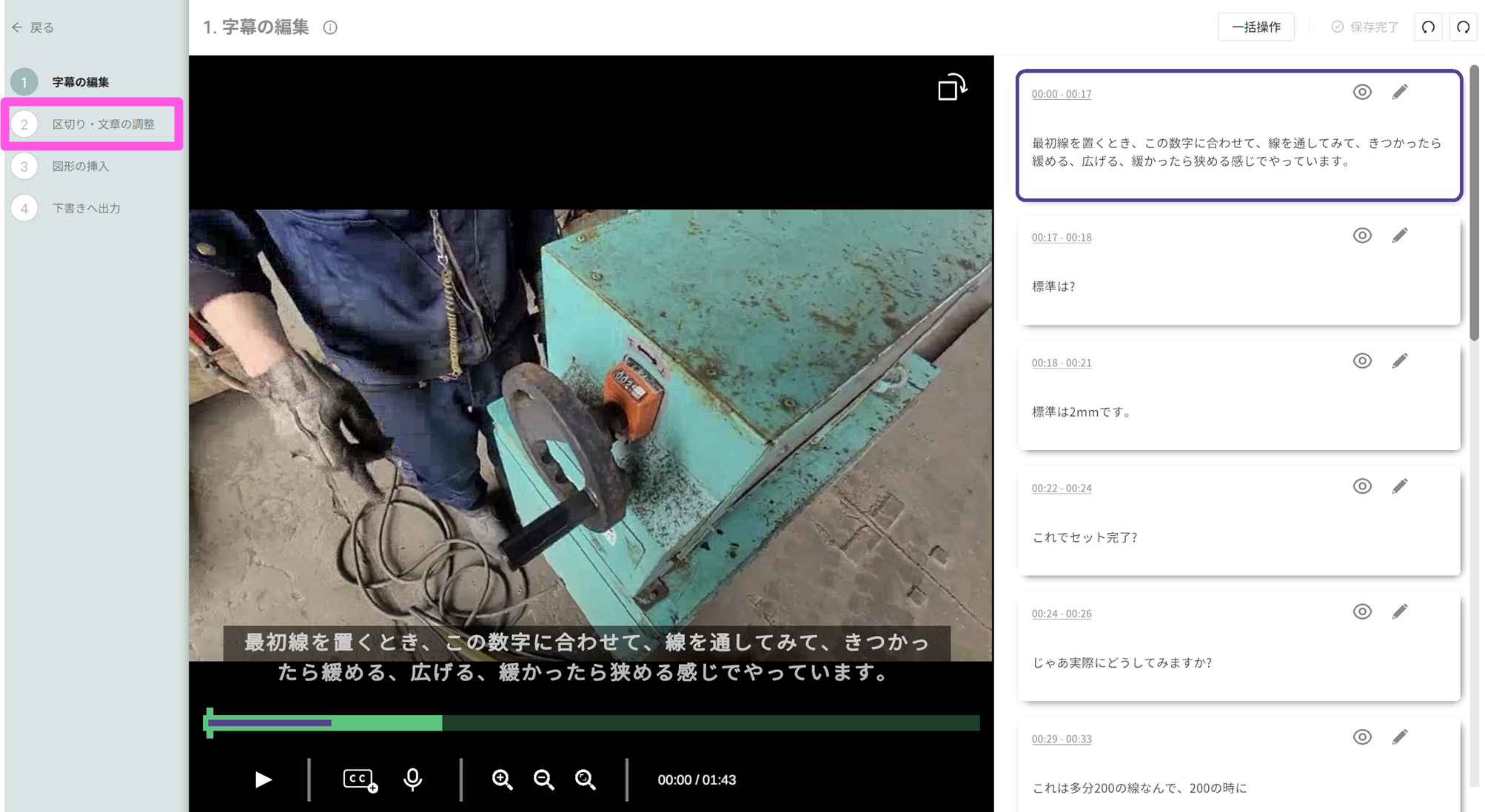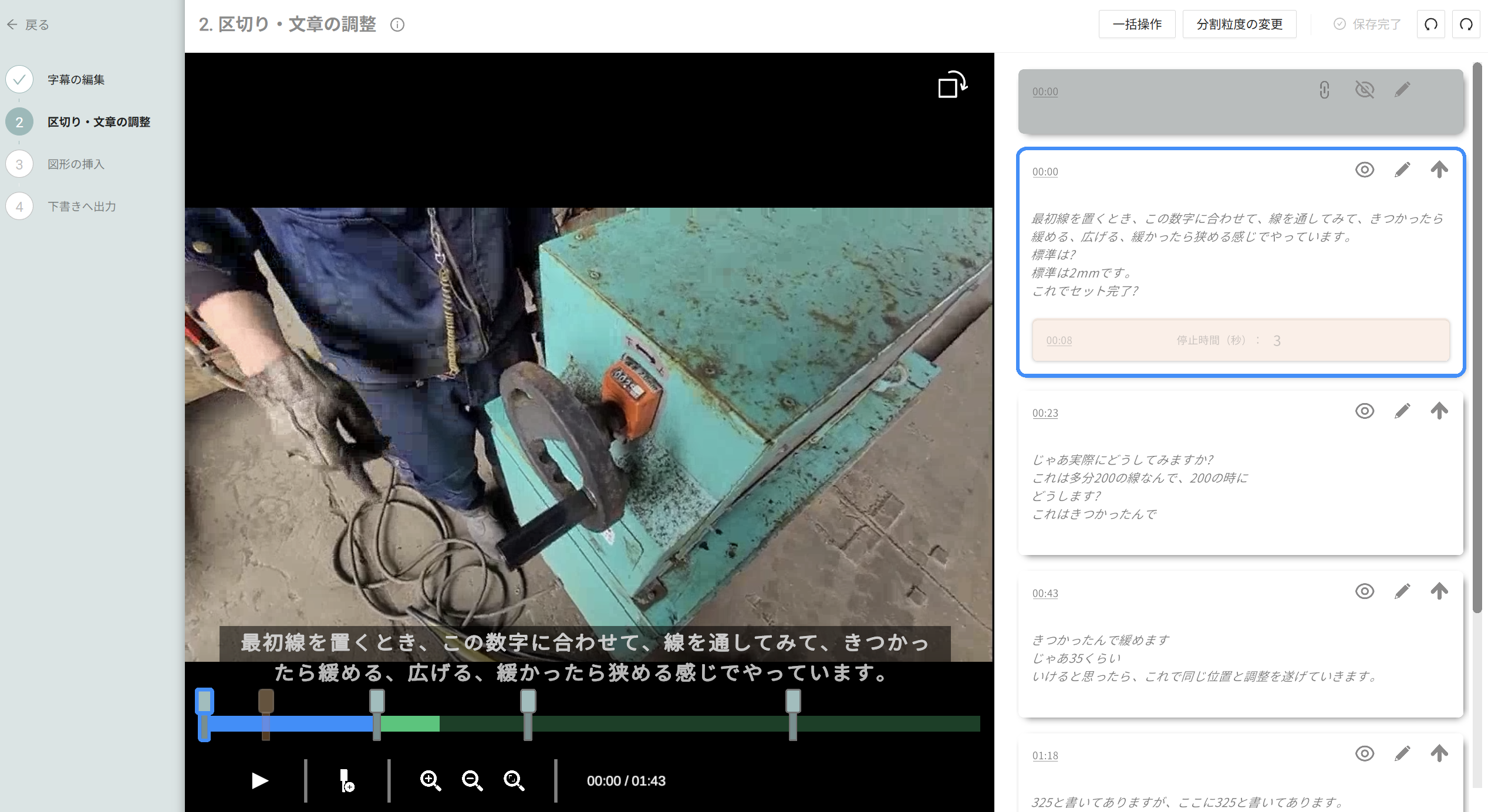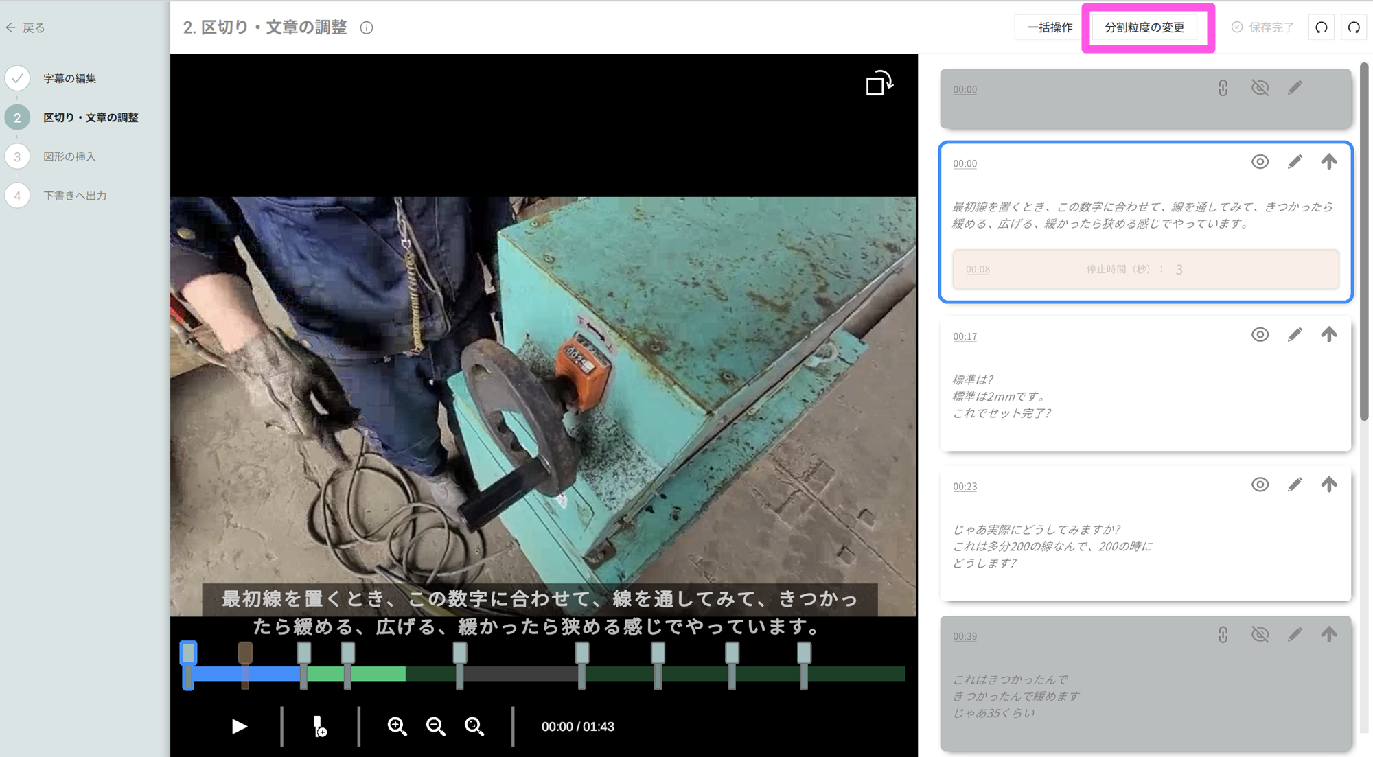 分割粒度を再調整したい 2026年02月09日 02:55 更新 対象の動画素材をクリック→[編集]クリックで、動画編集画面を開く[2. 区切り・文章の調整]をクリック[分割粒度の変更]をクリック[分割の粒度]を所望のもに変更し、[この内容で実行する]をクリック 粒度が変更されます。 関連記事 解説がない動画を素材にした作成のコツ 読み上げ・動画音声ミュートの設定変更 [発生中] iOSアプリの手順書観覧において、同じ動画素材が並ぶとき、手順2以降が動画読み込みが完了しない 【修正済み】 自動翻訳で文字化けする 【メディア掲載】「安全スタッフ」にてお客様のDiveのAR活用事例が紹介されました