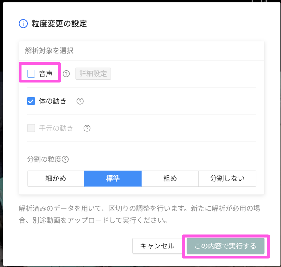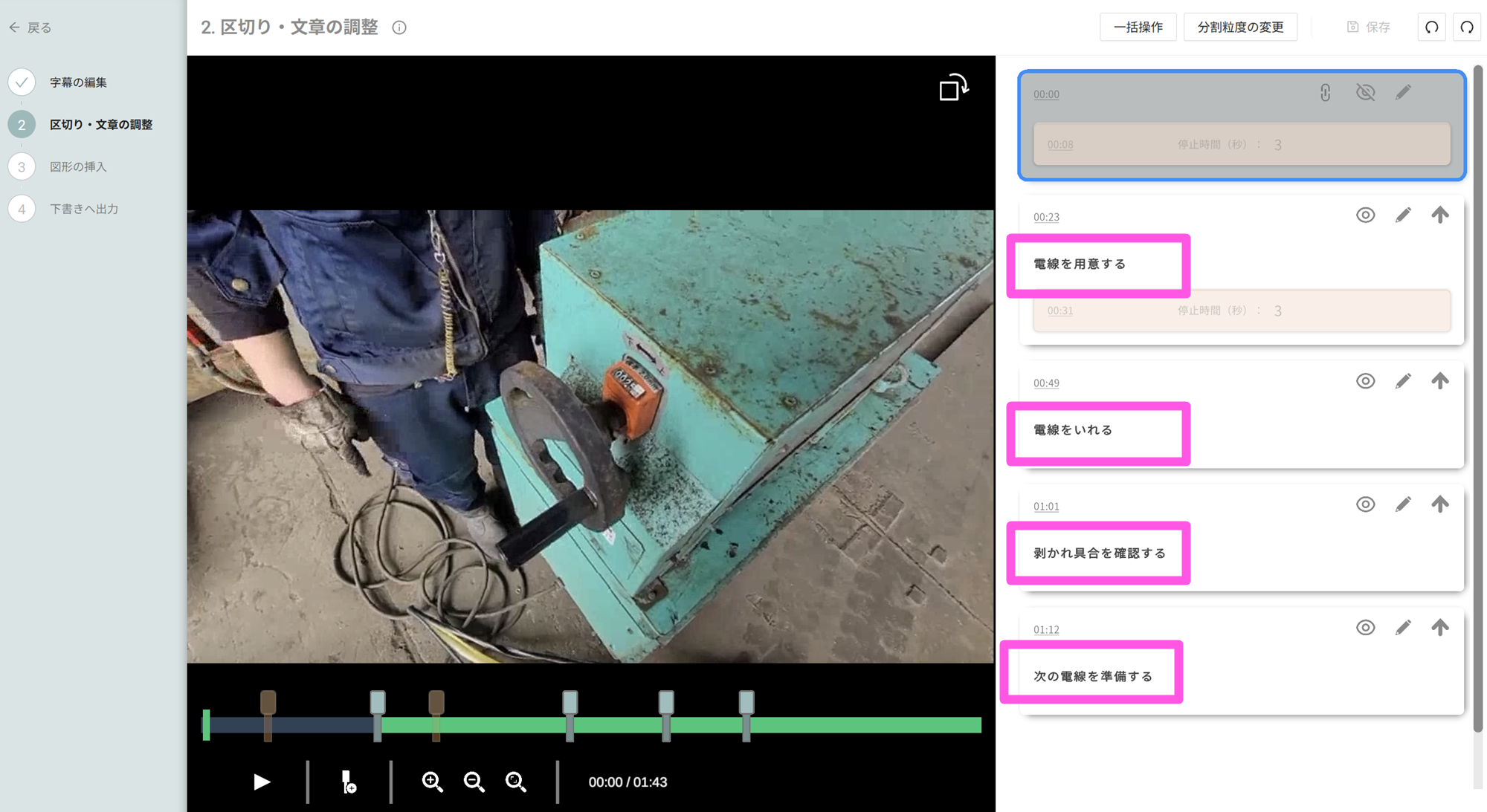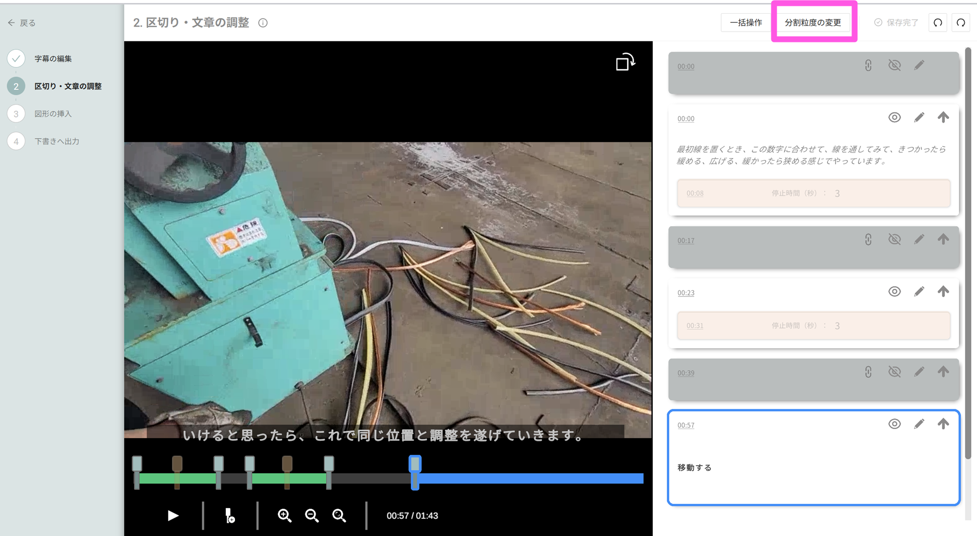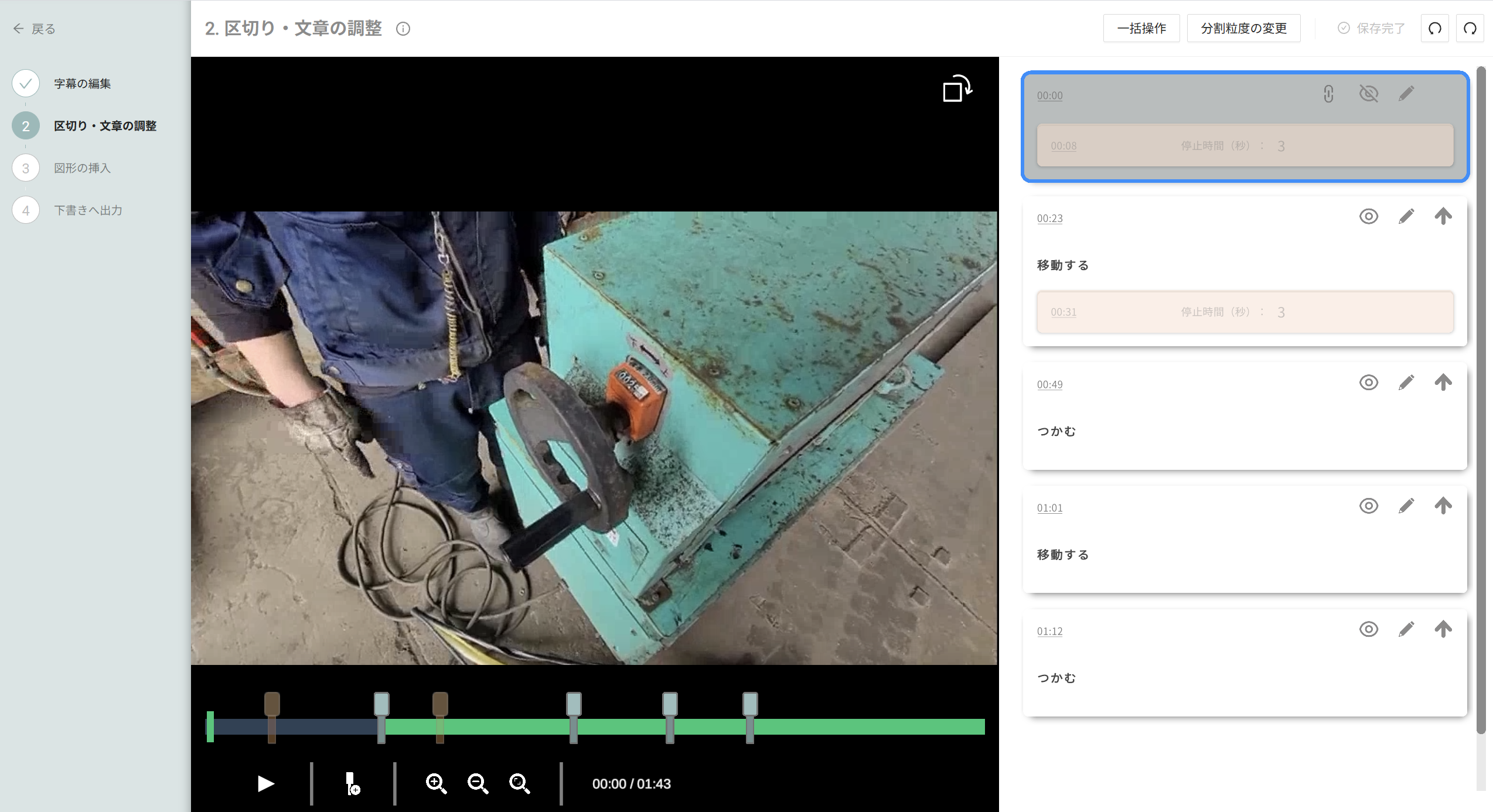 - 分割粒度は標準で10秒ほど、粗めで30秒ほどです。1手順が長い場合だと10秒だと細かすぎるケースがあるので、粒度変更もお試しください。