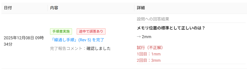 - 紐づけられた手順書の観覧完了の履歴。設問回答の結果も確認できます。