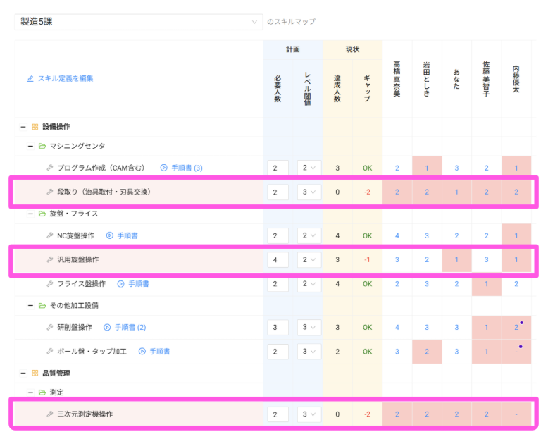 - 運用開始時のスキルマップが完成します。下記にように計画値と現状のギャップが可視化されます。