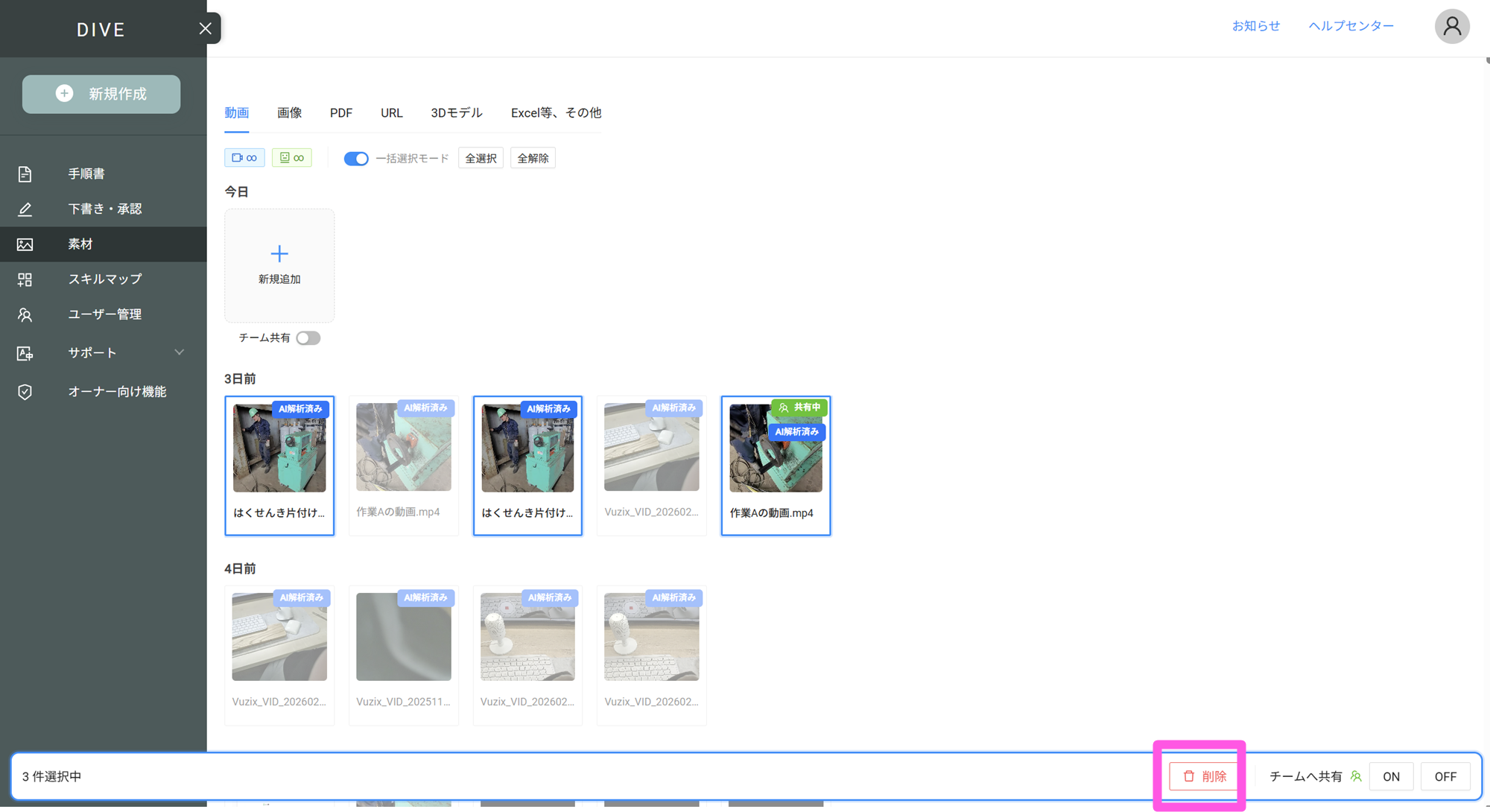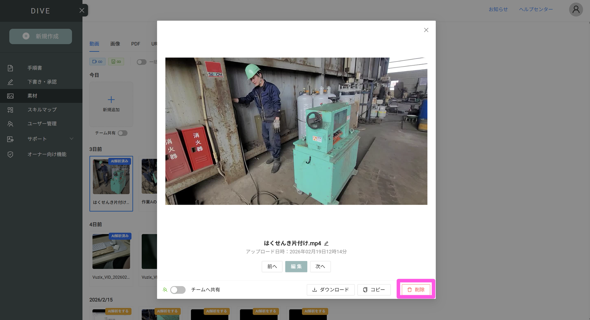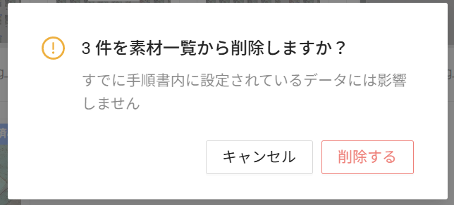チーム共有されている素材の場合は共有元のユーザーのみが削除可能のため、削除実行ができません。
