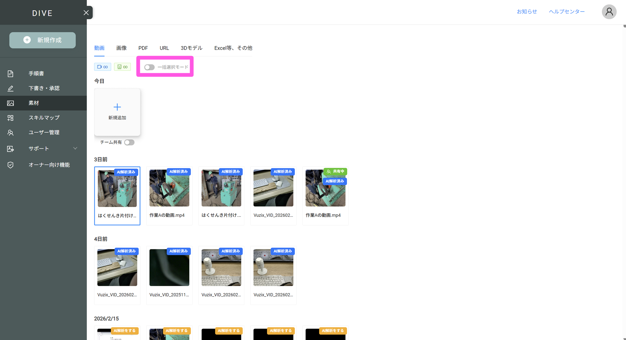 例)「チーム共有」のタグがある場合、その素材はチーム内の他ユーザーがアップロードした素材です。