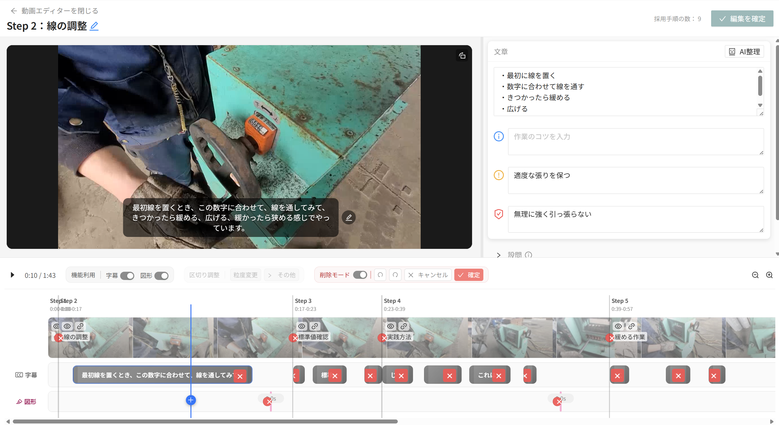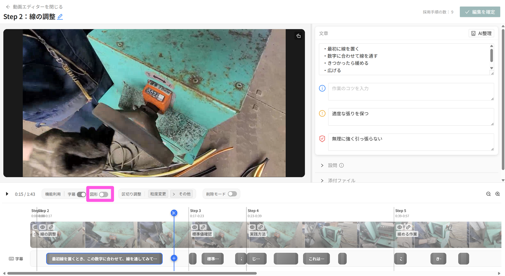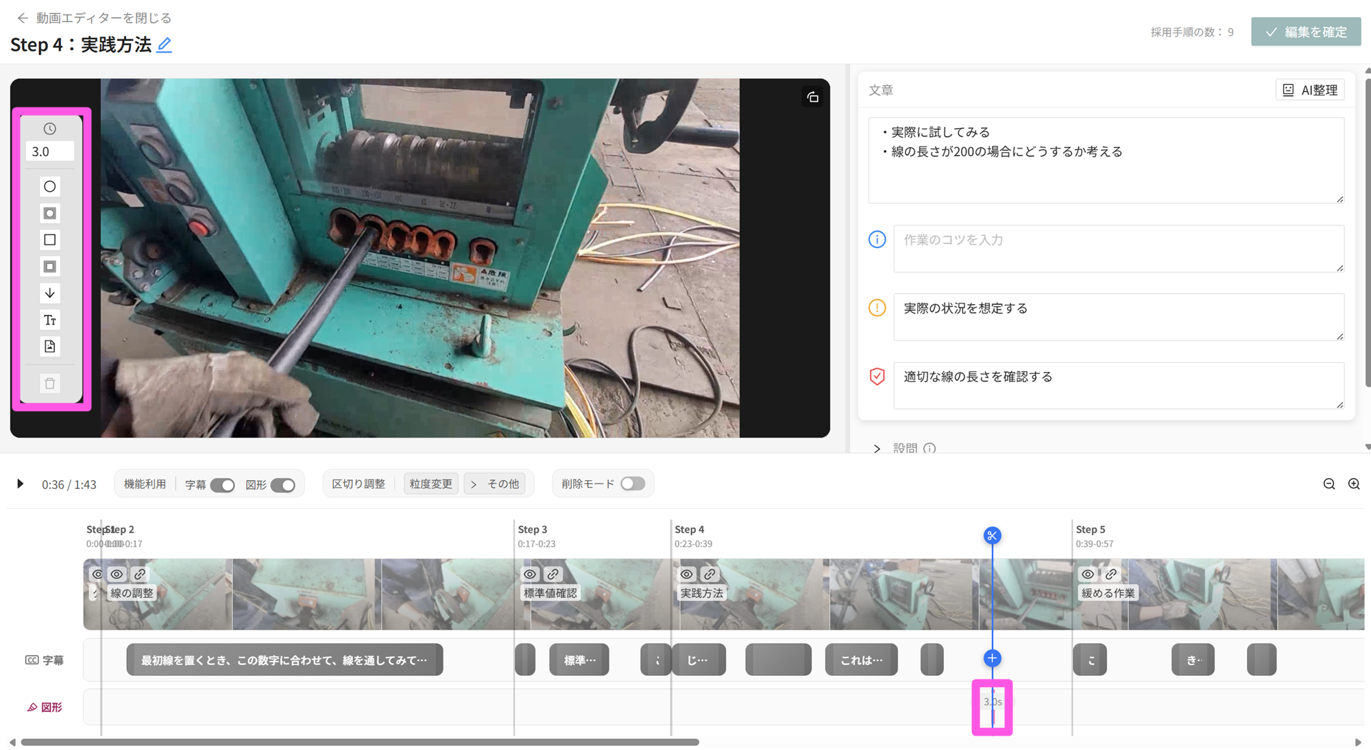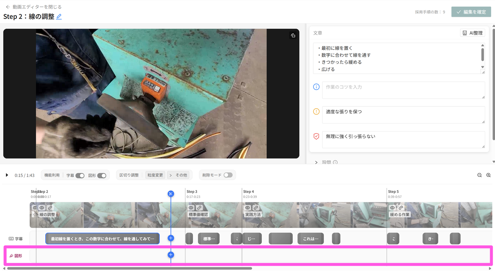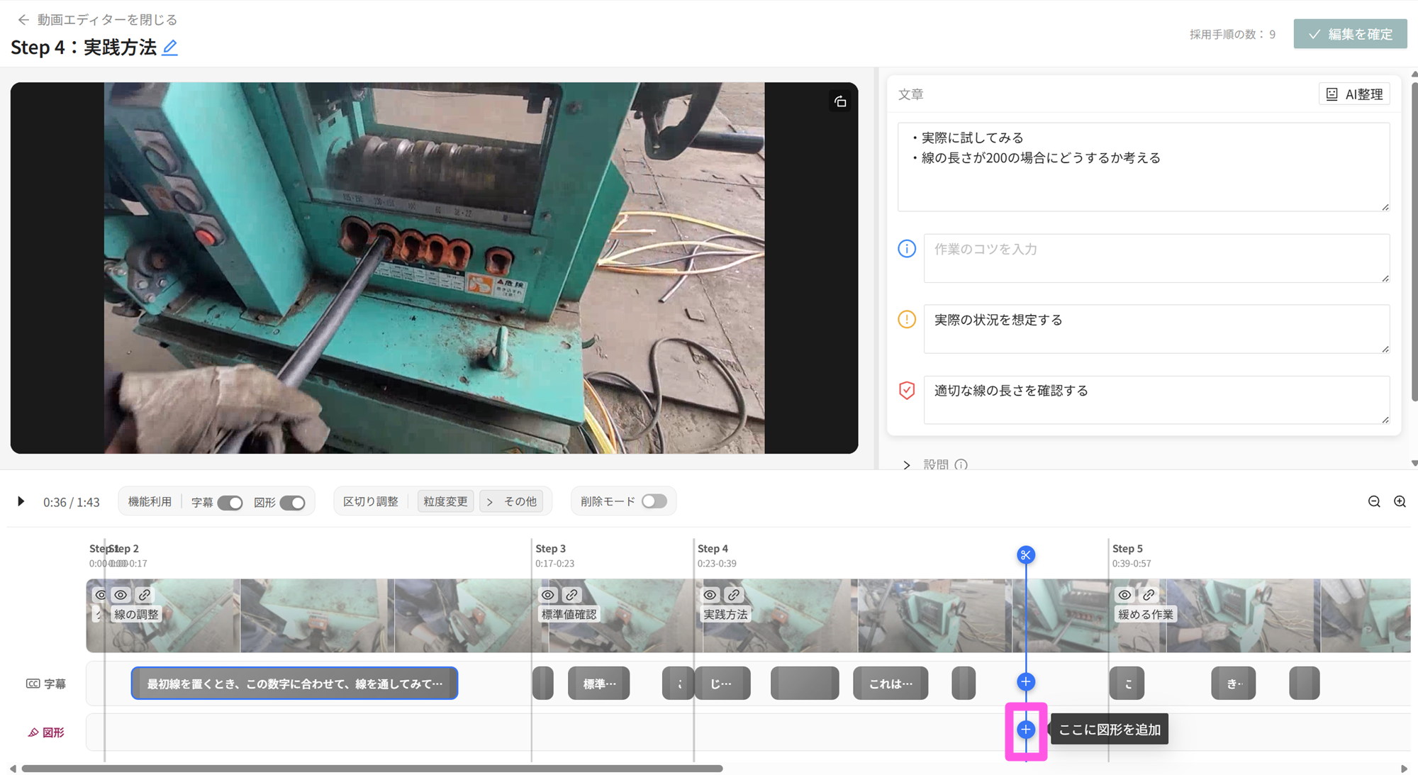 - 図形の挿入タイミングはタイムラインでのドラッグ操作、削除操作は区切り、字幕と同様に実施できます。