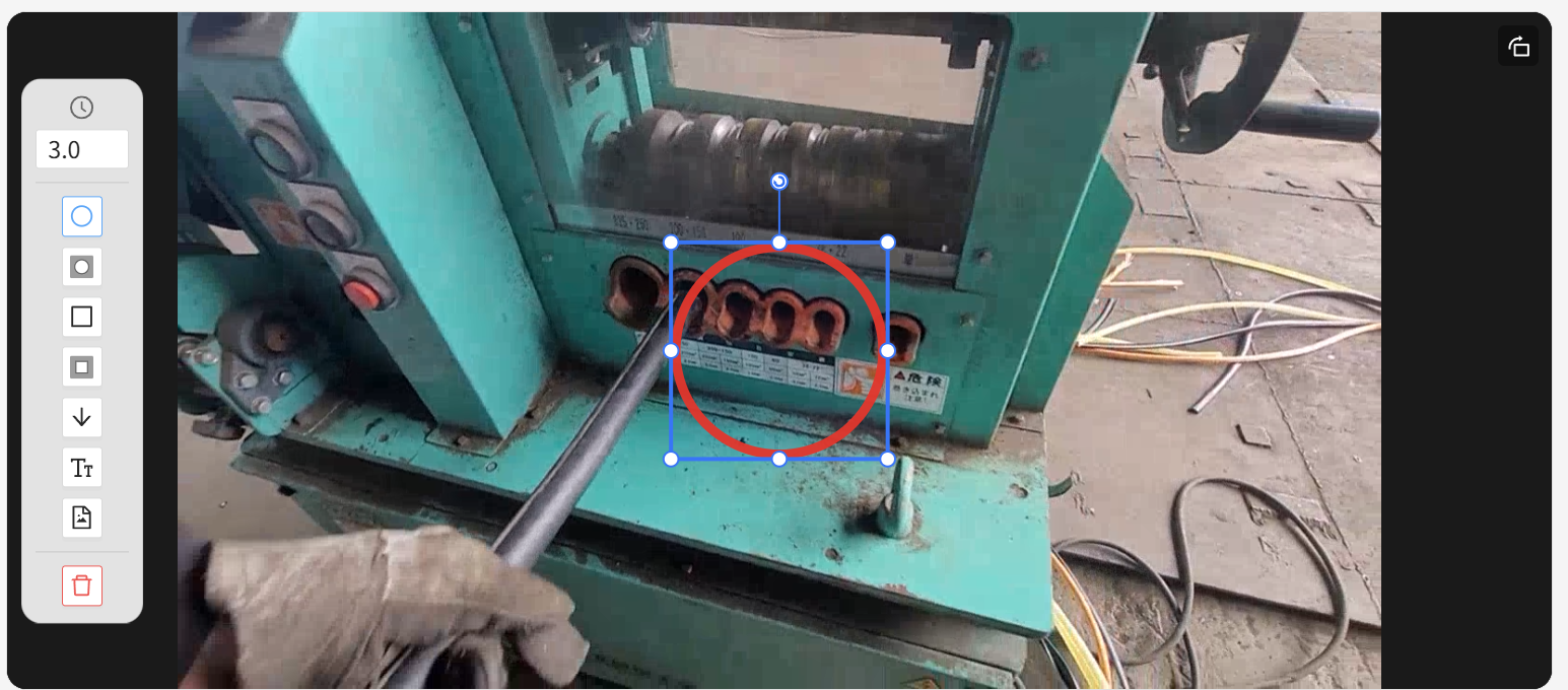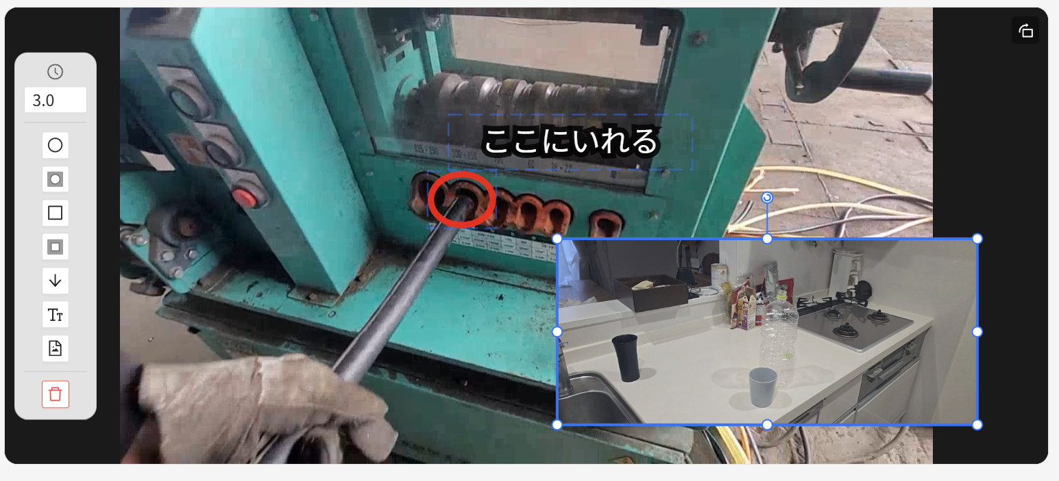 - 新たなに図形挿入が定義され、動画領域にツールバーが表示されます。Diveにおいては、図形挿入タイミングで動画が指定秒静止する動きをします(デフォルト3秒)。