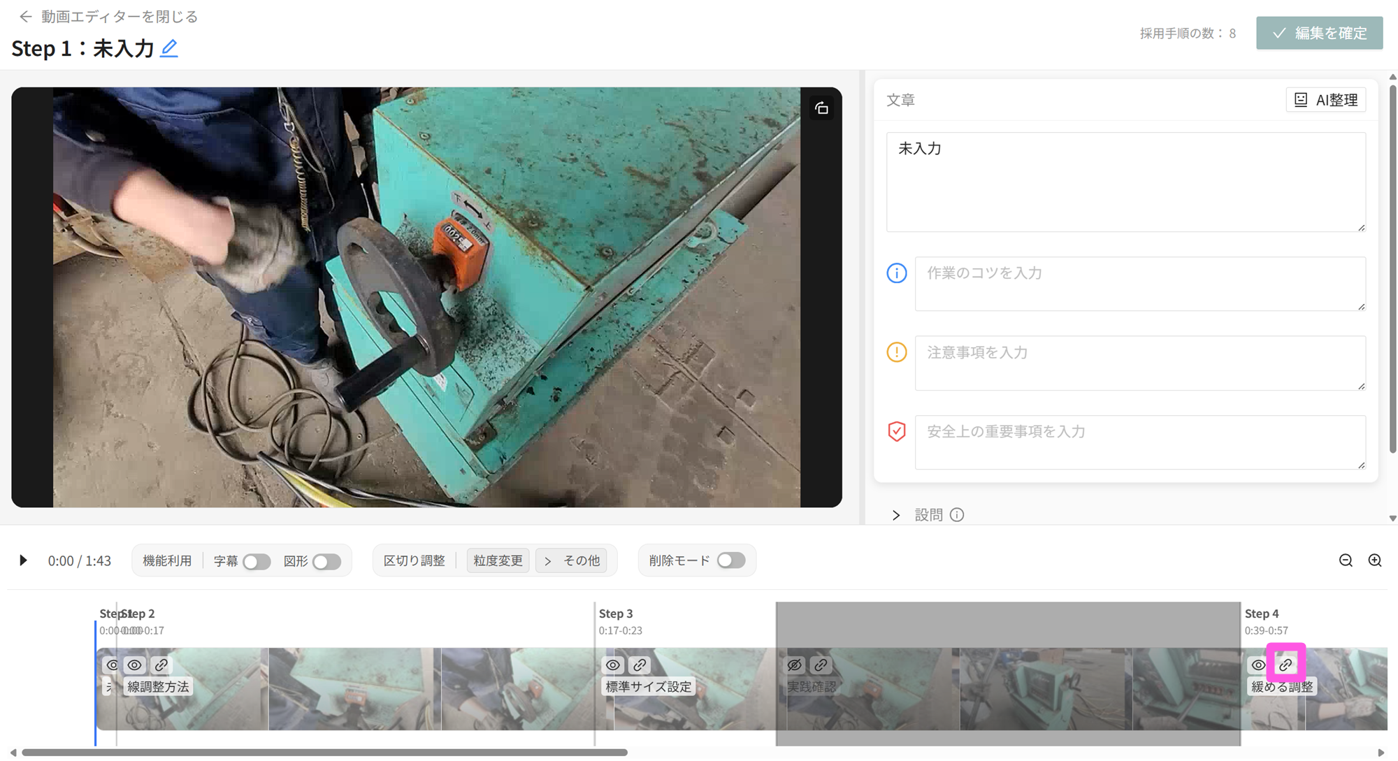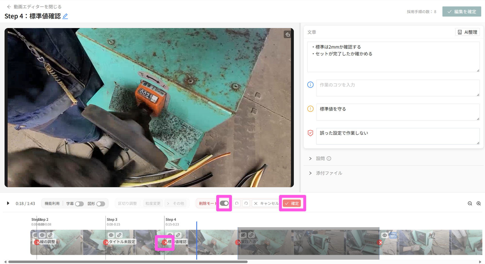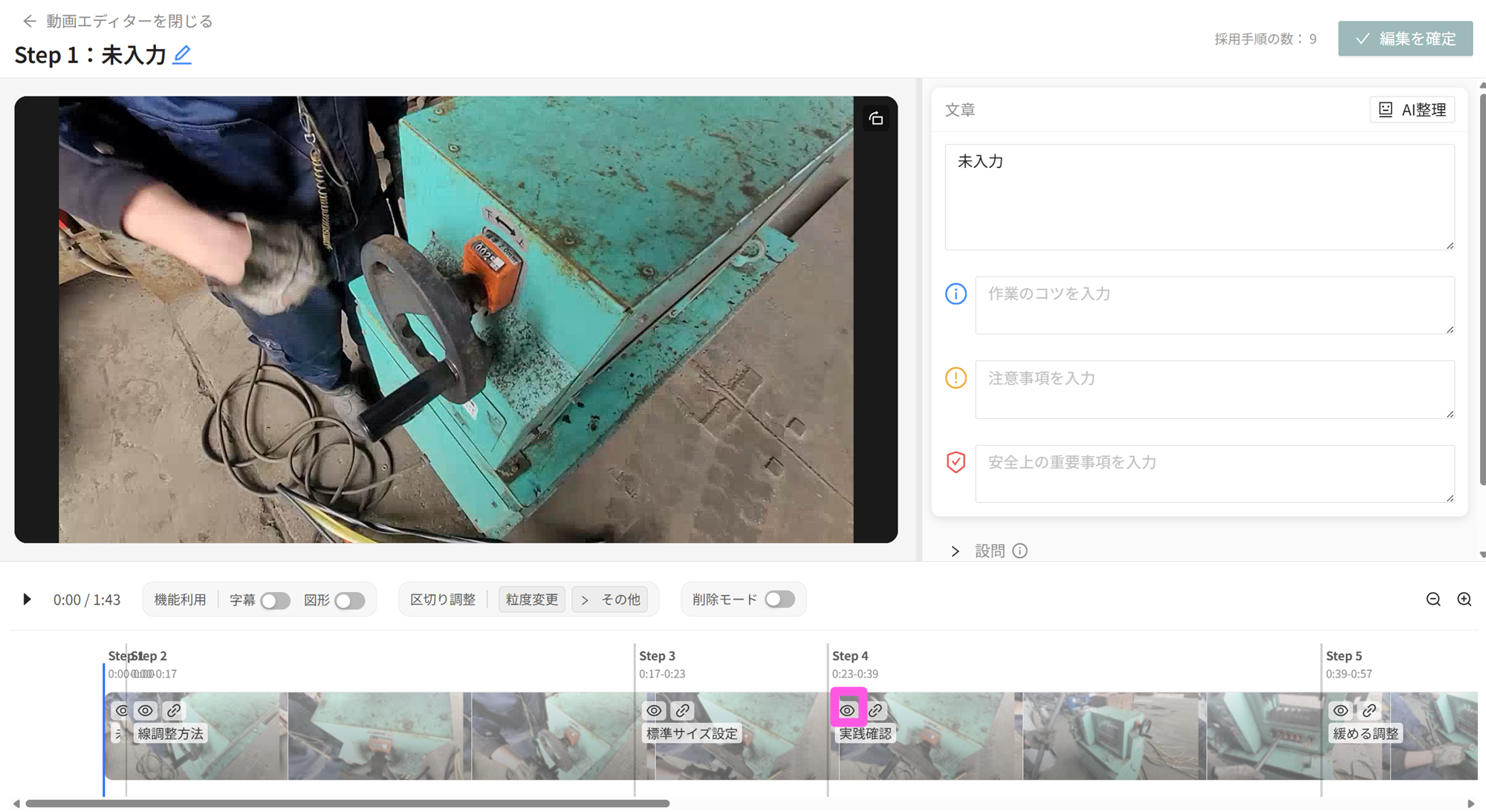 - タイムラインで不要な区切りにある[目]のボタンをクリックします(下記例では、Step4の内容が不要という想定です)。