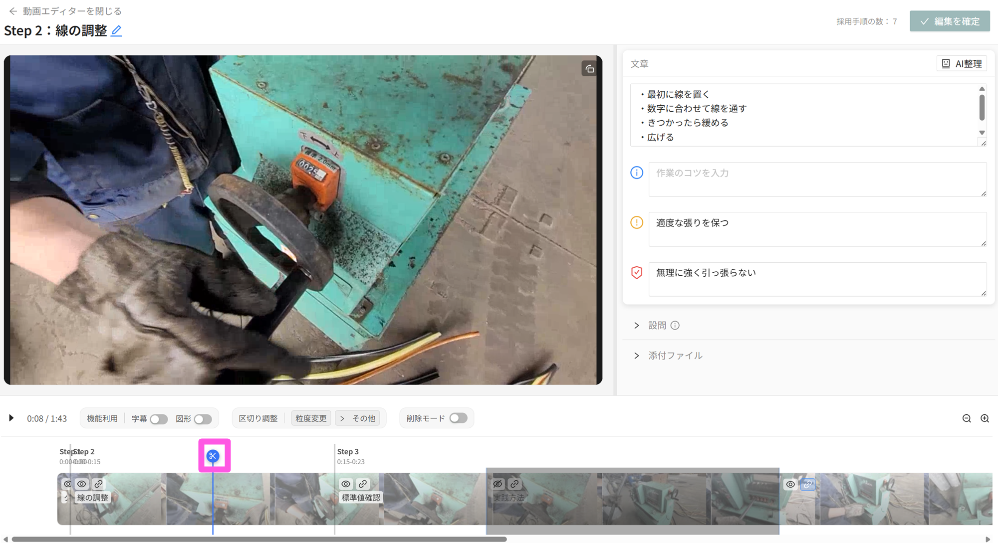 - 手順が結合され、1つの手順として扱われます。カット部分の高さが低くなり、後続の手順の番号も変わります。