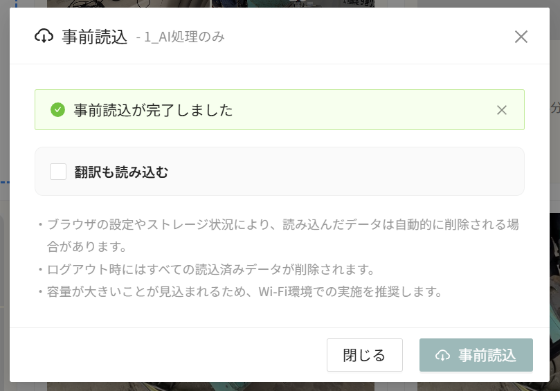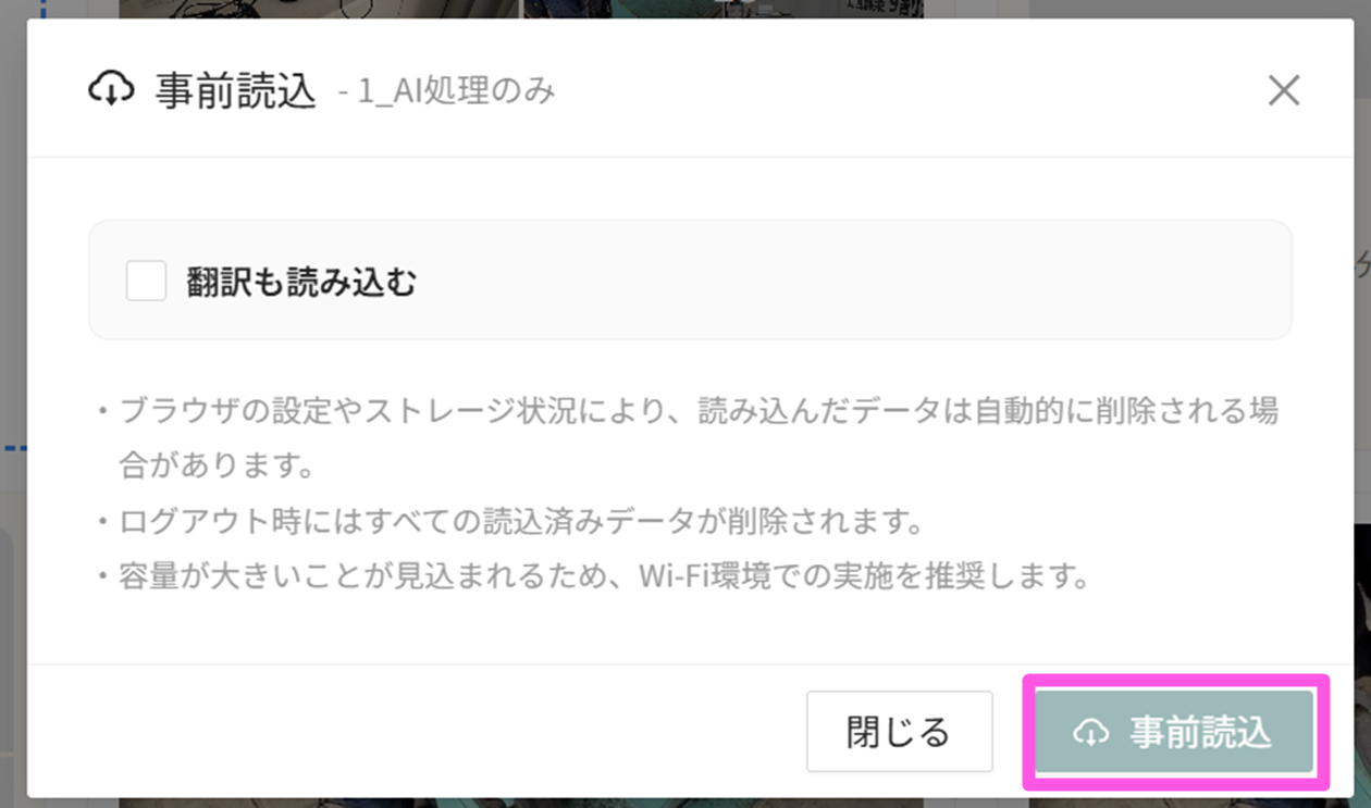- [事前読込]をクリック。翻訳も利用する場合は、翻訳も読み込むから設定ください。