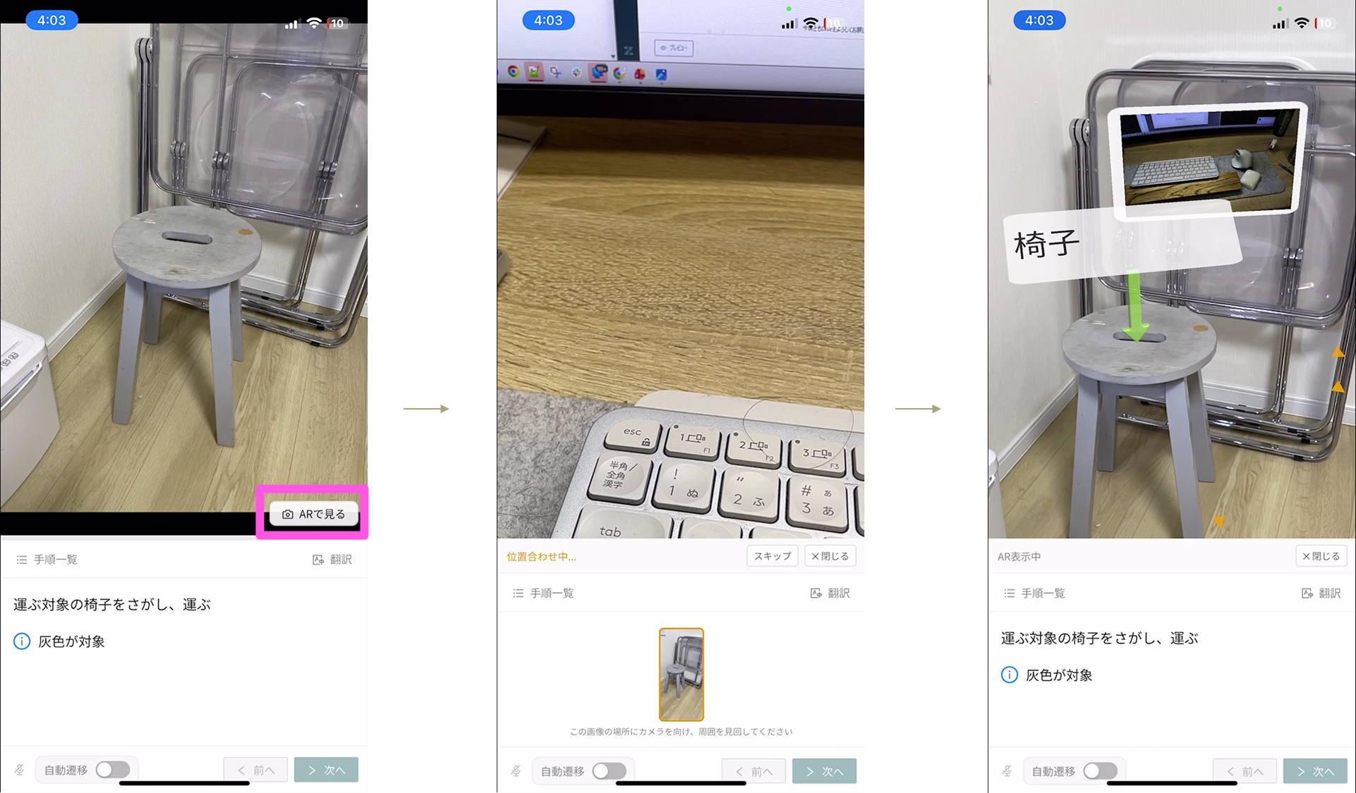 ARが設定されてる手順の場合、[ARで見る]ボタンが表示され、そこをタップするとARモードになります。