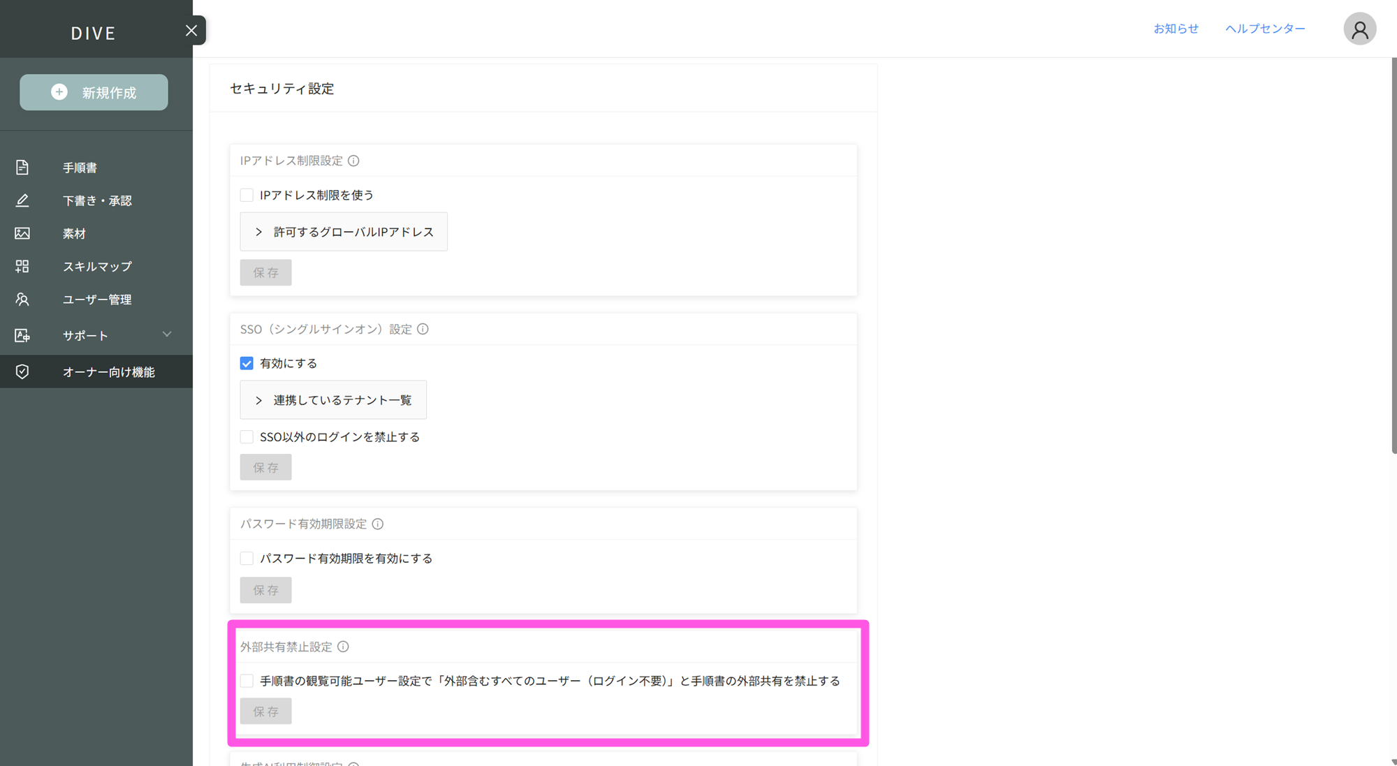 [外部共有禁止設定]でのチェックボックスをクリックし、「保存」をクリック